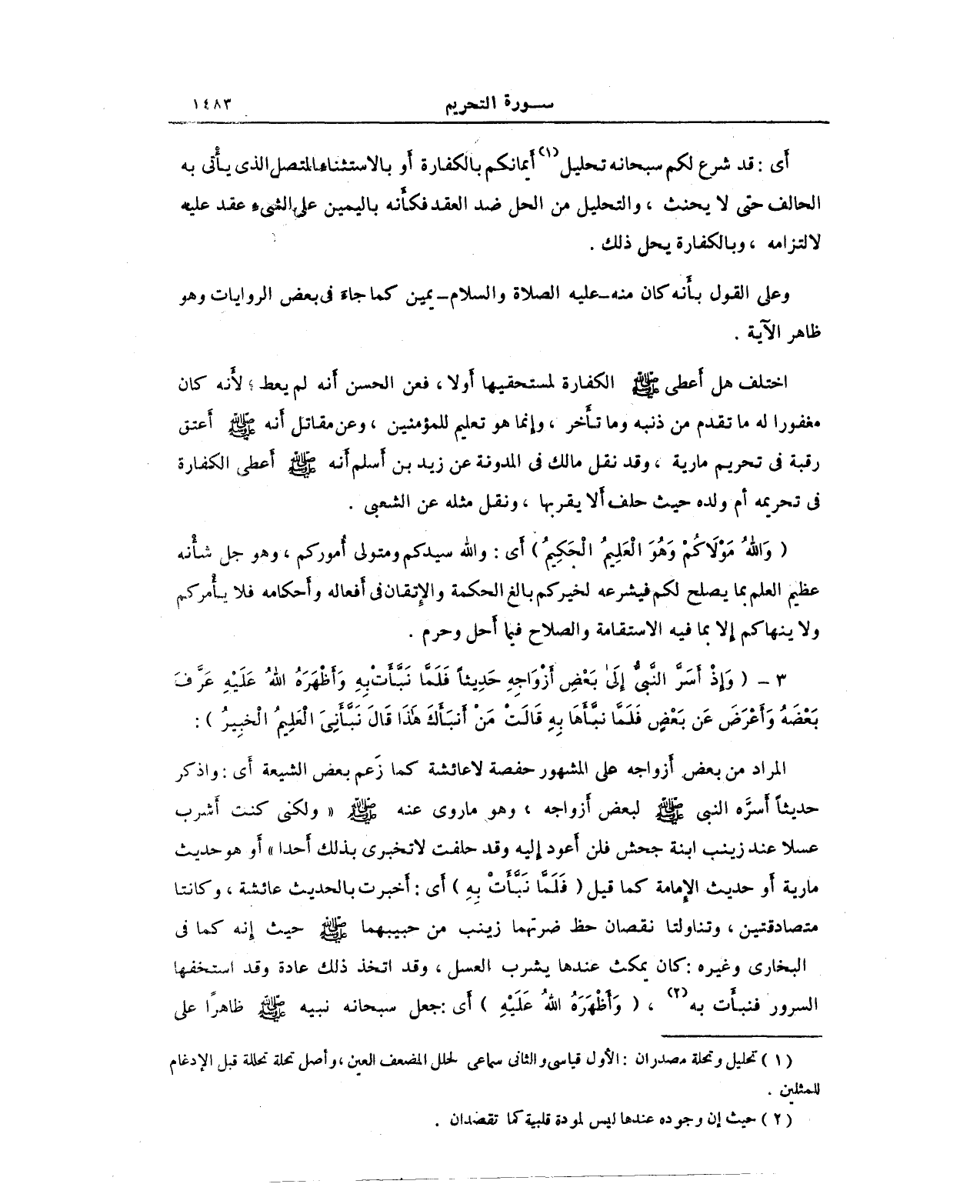 (¬1) تحليل وتحلة مصدران: الأَول قياسي والثاني سماعي لحلل المضعف العين، وأَصل تحلة تحللة قبل الإِدغام للمثلين.