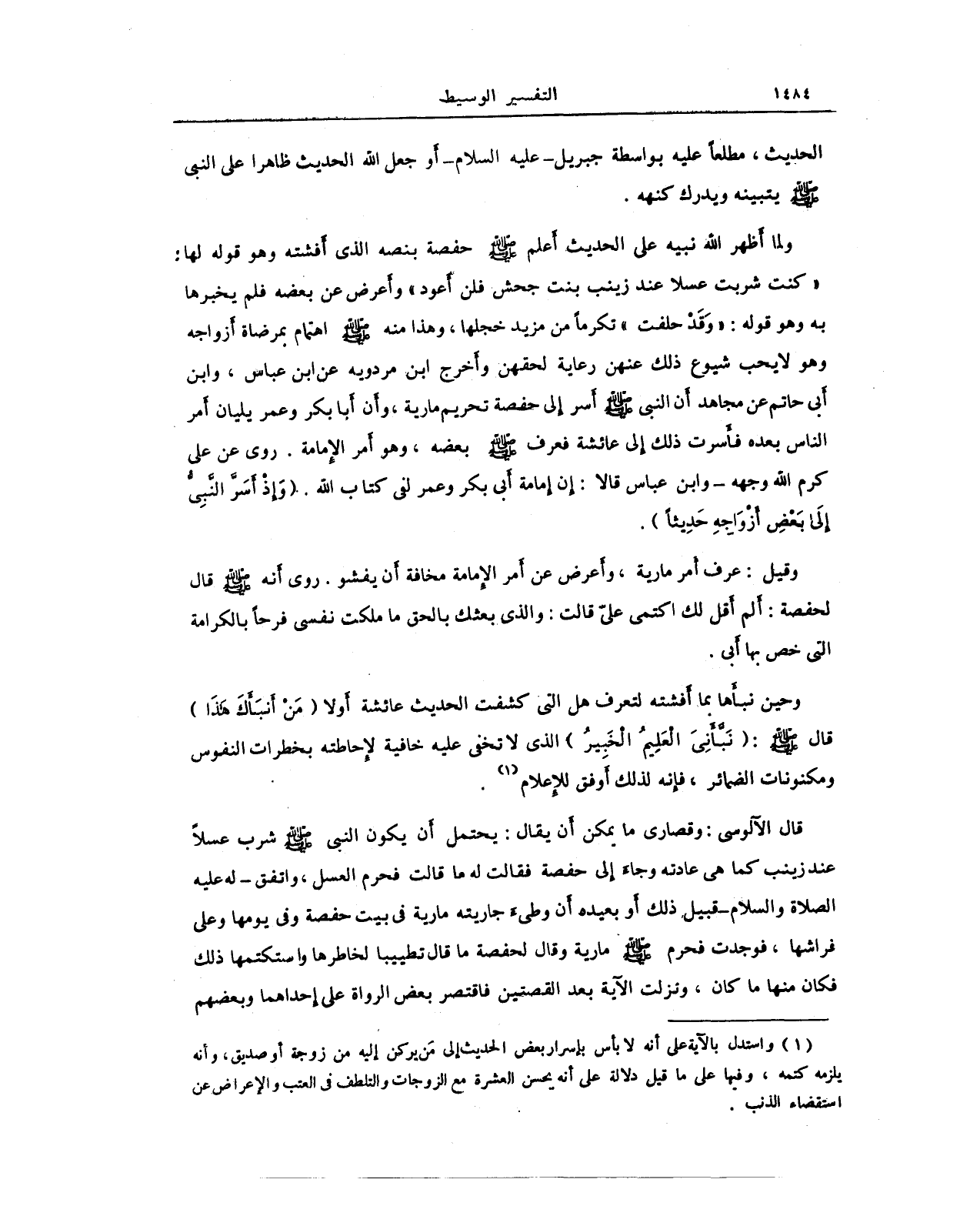 قال الآلوسي: وقصارى ما يمكن أَن يقال: يحتمل أَن يكون النبي صلى الله عليه وسلم شرب عسلًا عند زينب كما هي عادته وجاءَ إِلى حفصة فقالت له ما قالت فحرم العسل، واتفق - له عليه الصلاة والسلام - قبيل ذلك أَو بعيده أَن وطيءَ جاريته مارية في بيت حفصة وفي يومها وعلى فراشها، فوجدت فحرم صلى الله عليه وسلم مارية وقال لحفصه ما قال تطييبا لخاطرها واستكتمها ذلك فكان منها ما كان، ونزلت الآية بعد القصتين فاقتصر بعض الرواة على إِحداهما وبعضهم