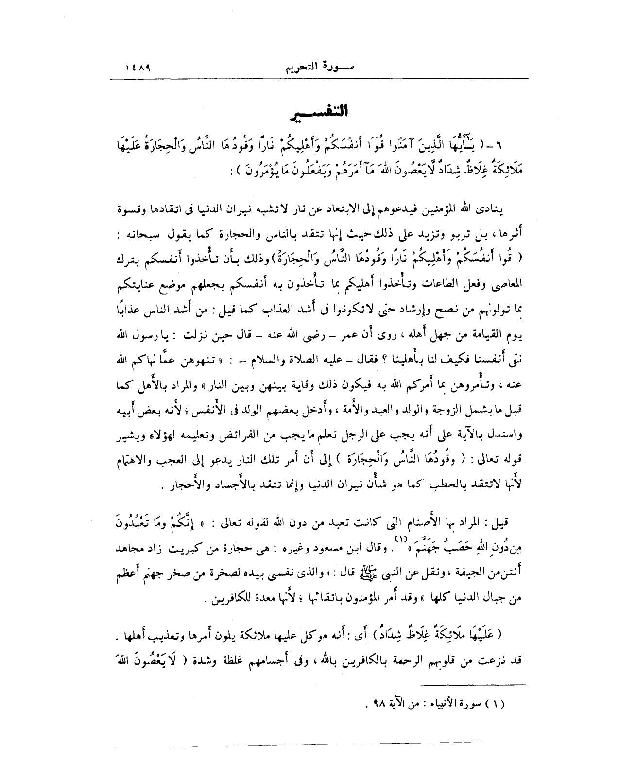 ينادي الله المؤمنين فيدعوهم إِلى الابتعاد عن نار لا تشبه نيران الدنيا في اتقادها وقسوة أَثرها، بل تربو وتزيد على ذلك حيث إِنها تتقد بالناس والحجارة كما يقول سبحانه: (قُوا أَنفُسَكُمْ وَأَهْلِيكُمْ نَارًا وَقُودُهَا النَّاسُ وَالْحِجَارَةُ) وذلك بأَن تأخذوا أَنفسكم بترك المعاصي وفعل الطاعات وتأخذوا أَهليكم بما تأخذون به أَنفسكم بجعلهم موضع عنايتكم بما تولونهم من نصح وإِرشاد حتى لا تكونوا في أَشد العذاب كما قيل: من أَشد الناس عذابًا يوم القيامة من جهل أَهلة، روي أَن عمر - رضي الله عنه - قال حين نزلت: يا رسول الله نقي أَنفسنا فكيف لنا بأَهلينا؟ فقال عليه الصلاة والسلام: "تنهوهن عمَّا نهاكم الله عنه، وتأمروهن بما أَمركم الله به فيكون ذلك وقاية بينهن وبين النار" والمراد بالأَهل كما قيل ما يشمل الزوجة والولد والعبد والأَمة، وأَدخل بعضهم الولد في الأَنفس؛ لأَنه بعض أَبيه واستدل بالآية على أَنه يجب على الرجل تعلم ما يجب من الفرائض وتعليمه لهؤلاءِ ويشير قوله تعالى: (وَقُودُهَا النَّاسُ وَالْحِجَارَةُ) إِلى أَن أَمر تلك النار يدعو إِلى العجب والاهتمام لأَنها لا تتقد بالحطب كما هو شأن نيران الدنيا وإِنما تتقد بالأَجساد والأَحجار.
