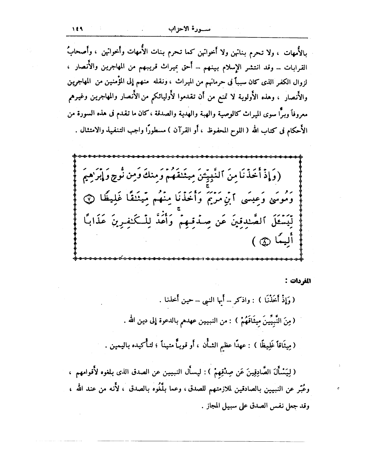 {وَإِذْ أَخَذْنَا مِنَ النَّبِيِّينَ مِيثَاقَهُمْ وَمِنْكَ وَمِنْ نُوحٍ وَإِبْرَاهِيمَ وَمُوسَى وَعِيسَى ابْنِ مَرْيَمَ وَأَخَذْنَا مِنْهُمْ مِيثَاقًا غَلِيظًا (7) لِيَسْأَلَ الصَّادِقِينَ عَنْ صِدْقِهِمْ وَأَعَدَّ لِلْكَافِرِينَ عَذَابًا أَلِيمًا (8)}