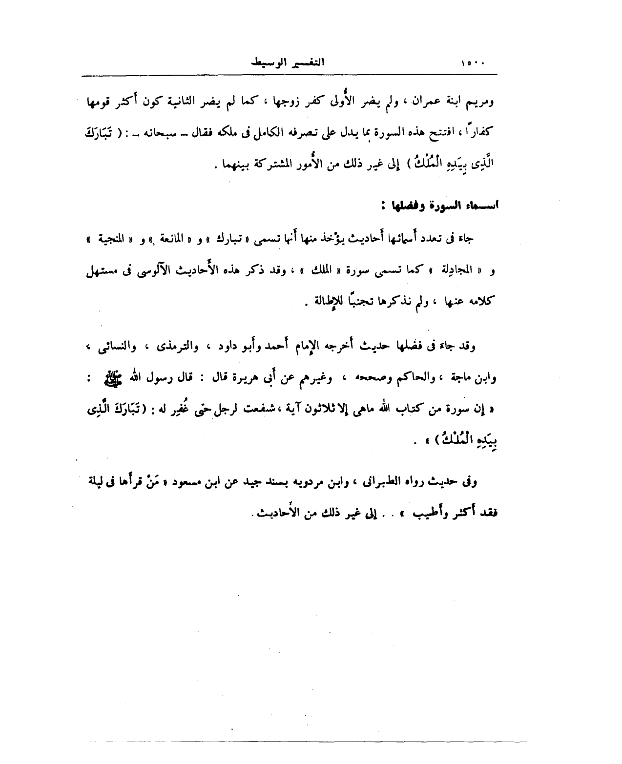 وقد جاءَ في فضلها حديث أَخرجه الإِمام أَحمد وأَبو داود، والترمذي، والنسائي، وابن ماجه، والحاكم وصححه، وغيرهم عن أَبي هريرة قال: قال رسول الله صلى الله عليه وسلم "إِن سورة من كتاب الله ما هي إِلا ثلاثون آية، شفعت لرجل حتى غفر له: (تَبَارَكَ الَّذِي بِيَدِهِ الْمُلْكُ).