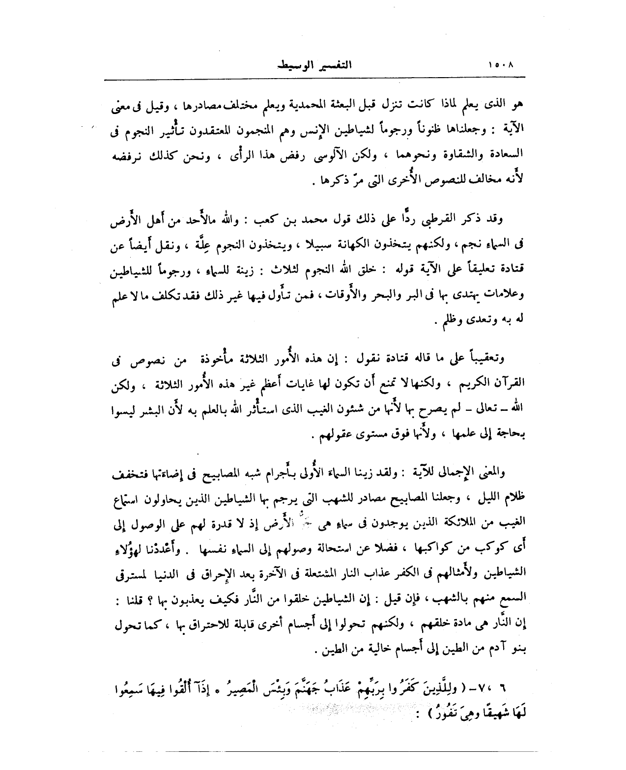 والمعنى الإِجمالي للآية: ولقد زينا السماءَ الأُولى بأَجرام شبه المصابيح في إضاءَتها فتخفف ظلام الليل، وجعلنا المصابيح مصادر للشهب التي يرجم بها الشياطين الذين يحاولون استماع الغيب من الملائكة الذين يوجدون في سماءٍ هي جوّ الأَرض إِذا لا قدرة لهم على الوصول إِلى أَي كوكب من كواكبها، فضلا عن استحالة وصولهم إِلى السماءِ نفسها. وأَعْددْنا لهؤْلاءِ الشياطين ولأَمثالهم في الكفر عذاب النار المشتعلة في الآخرة بعد الإِحراق في الدنيا لمسترقي السمع منهم بالشهب، فإن قيل: إِن الشياطين خلقوا من النَّار فكيف يعذبون بها؟ قلنا: إِن النَّار هي مادة خلقهم، ولكنهم تحولوا إِلى أَجسام أخرى قابلة للاحتراق بها، كما تحول بنو آدم من الطين إِلى أَجسام خالية من الطين.
