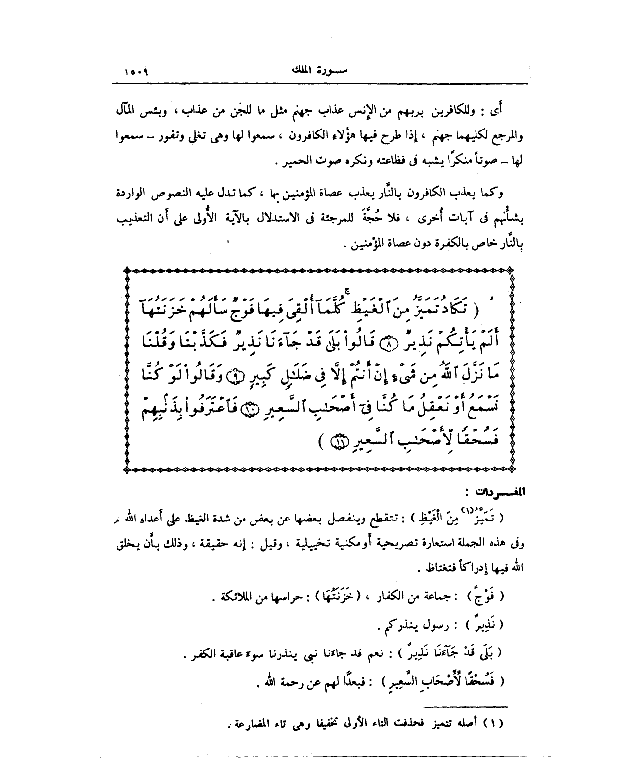 (تَمَيَّزُ (¬1) مِنْ الْغَيْظِ): تتقطع وينفصل بعضها عن بعض من شدة الغيظ على أَعداءِ الله وفي هذه الجملة استعارة تصريحية أَو مكنية تخييلية، وقيل: إِنه حقيقة، وذلك بأَن يخلق الله فيها إِدراكًا فتغتاظ.