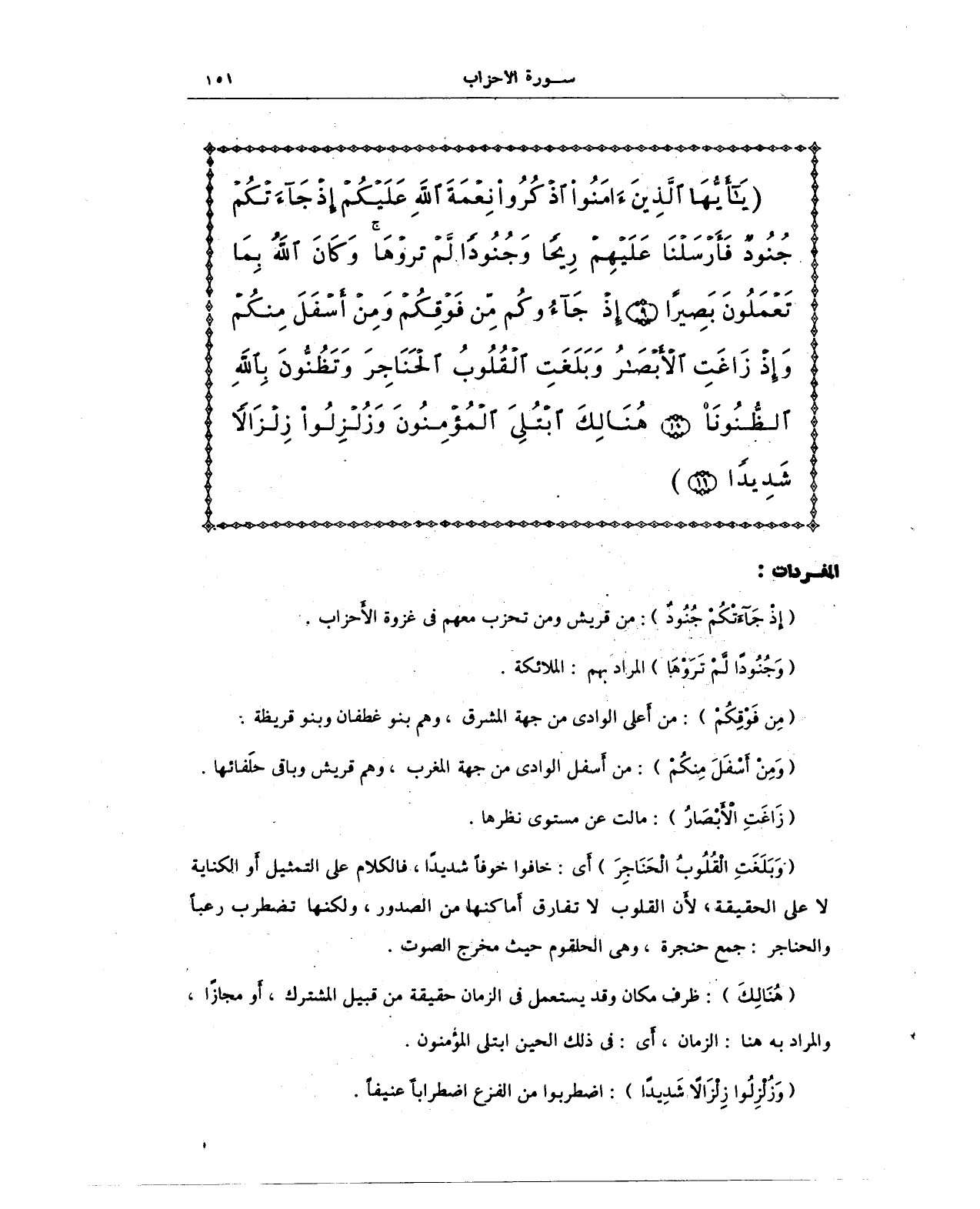 {يَا أَيُّهَا الَّذِينَ آمَنُوا اذْكُرُوا نِعْمَةَ اللَّهِ عَلَيْكُمْ إِذْ جَاءَتْكُمْ جُنُودٌ فَأَرْسَلْنَا عَلَيْهِمْ رِيحًا وَجُنُودًا لَمْ تَرَوْهَا وَكَانَ اللَّهُ بِمَا تَعْمَلُونَ بَصِيرًا (9) إِذْ جَاءُوكُمْ مِنْ فَوْقِكُمْ وَمِنْ أَسْفَلَ مِنْكُمْ وَإِذْ زَاغَتِ الْأَبْصَارُ وَبَلَغَتِ الْقُلُوبُ الْحَنَاجِرَ وَتَظُنُّونَ بِاللَّهِ الظُّنُونَا (10) هُنَالِكَ ابْتُلِيَ الْمُؤْمِنُونَ وَزُلْزِلُوا زِلْزَالًا شَدِيدًا (11)}