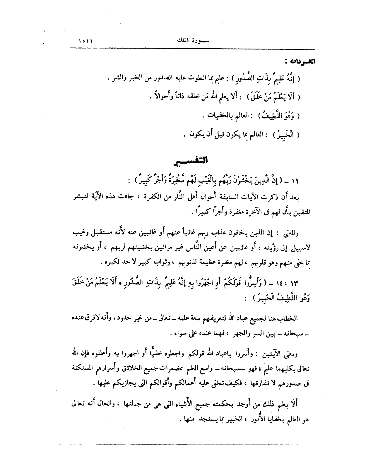 ومعني الآيتين: وأَسروا يا عباد الله قولكم واجعلوه خفيًّا أو اجهروا به وأَعلنوه فإِن الله تعالى بكليهما عليم؛ فهو - سبحانه - واسع العلم بمضمرات جميع الخلائق وأَسرارهم المستكنة في صدورهم لا تفارقها، فكيف تخفى أَعمالكم وأَقوالكم التي يجازيكم عليها.