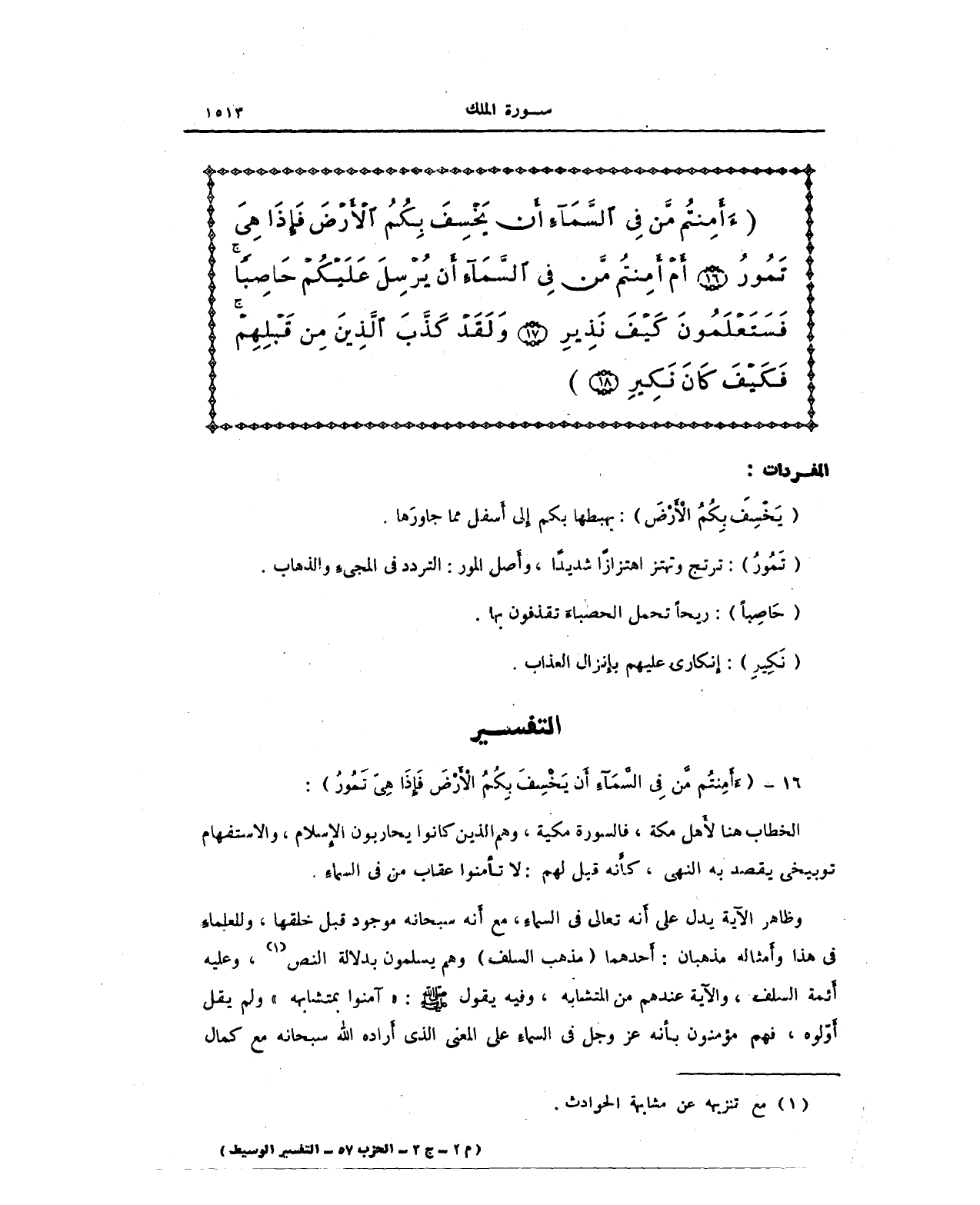 وظاهر الآية يدل على أَنه تعالى في السماءِ مع أَنه سبحانه موجود قبل خلقها، وللعلماءِ في هذا وأَمثاله مذهبان: أَحدهما (مذهب السلف) وهم يسلمون بدلالة النص (¬1)، وعليه أَئمة السلف، والآية عندهم من المتشابه، وفيه يقول صلى الله عليه وسلم: "آمنوا بمتشابهه" ولم يقل أَوّلوه، فهم مؤمنون بأَنه عز وجل في السماءِ على المعنى الذي أَراده الله سبحانه مع كمال