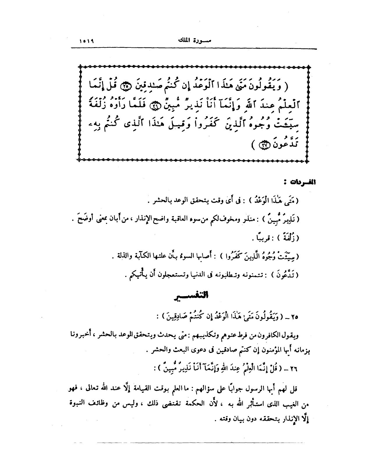 {وَيَقُولُونَ مَتَى هَذَا الْوَعْدُ إِنْ كُنْتُمْ صَادِقِينَ (25) قُلْ إِنَّمَا الْعِلْمُ عِنْدَ اللَّهِ وَإِنَّمَا أَنَا نَذِيرٌ مُبِينٌ (26) فَلَمَّا رَأَوْهُ زُلْفَةً سِيئَتْ وُجُوهُ الَّذِينَ كَفَرُوا وَقِيلَ هَذَا الَّذِي كُنْتُمْ بِهِ تَدَّعُونَ (27)}