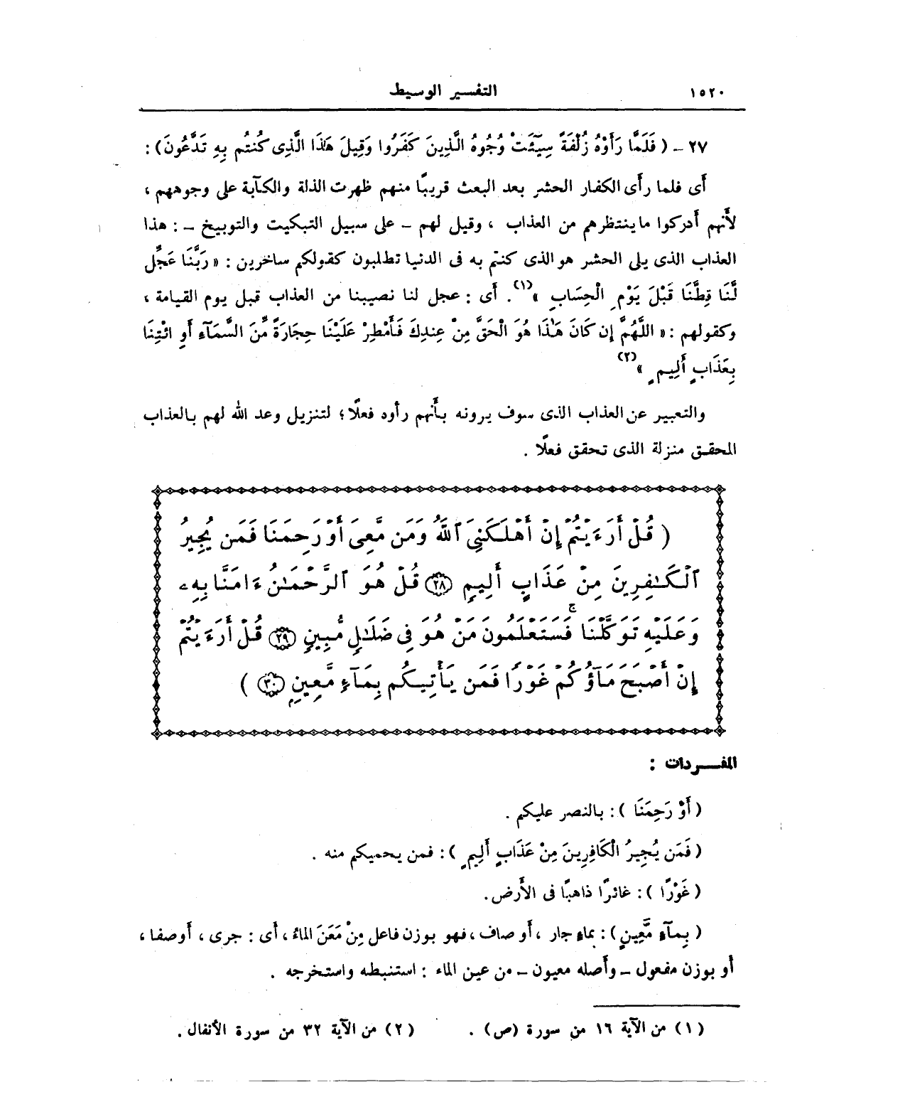 {قُلْ أَرَأَيْتُمْ إِنْ أَهْلَكَنِيَ اللَّهُ وَمَنْ مَعِيَ أَوْ رَحِمَنَا فَمَنْ يُجِيرُ الْكَافِرِينَ مِنْ عَذَابٍ أَلِيمٍ (28) قُلْ هُوَ الرَّحْمَنُ آمَنَّا بِهِ وَعَلَيْهِ تَوَكَّلْنَا فَسَتَعْلَمُونَ مَنْ هُوَ فِي ضَلَالٍ مُبِينٍ (29) قُلْ أَرَأَيْتُمْ إِنْ أَصْبَحَ مَاؤُكُمْ غَوْرًا فَمَنْ يَأْتِيكُمْ بِمَاءٍ مَعِينٍ (30)}