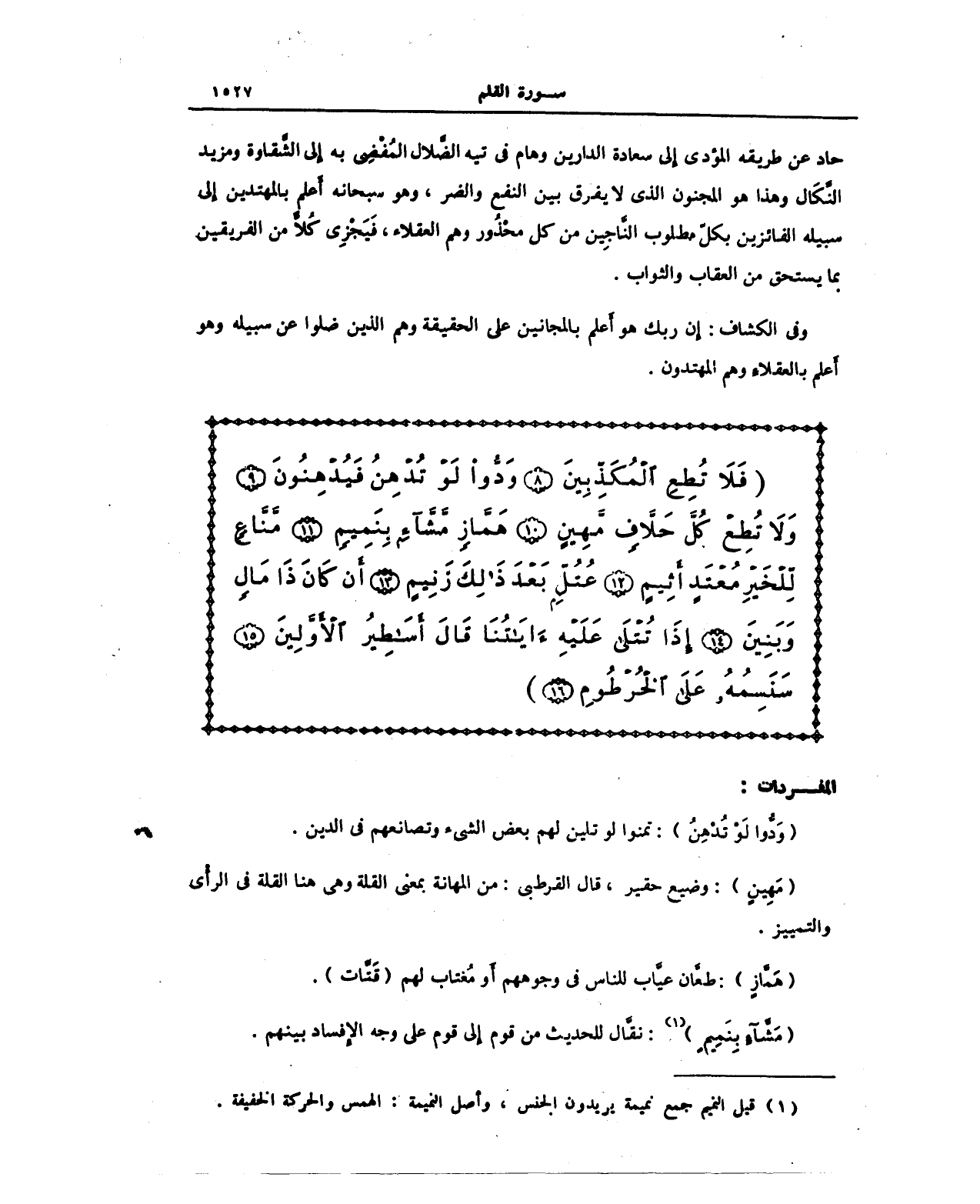 {فَلَا تُطِعِ الْمُكَذِّبِينَ (8) وَدُّوا لَوْ تُدْهِنُ فَيُدْهِنُونَ (9) وَلَا تُطِعْ كُلَّ حَلَّافٍ مَهِينٍ (10) هَمَّازٍ مَشَّاءٍ بِنَمِيمٍ (11) مَنَّاعٍ لِلْخَيْرِ مُعْتَدٍ أَثِيمٍ (12) عُتُلٍّ بَعْدَ ذَلِكَ زَنِيمٍ (13) أَنْ كَانَ ذَا مَالٍ وَبَنِينَ (14) إِذَا تُتْلَى عَلَيْهِ آيَاتُنَا قَالَ أَسَاطِيرُ الْأَوَّلِينَ (15) سَنَسِمُهُ عَلَى الْخُرْطُومِ (16)}