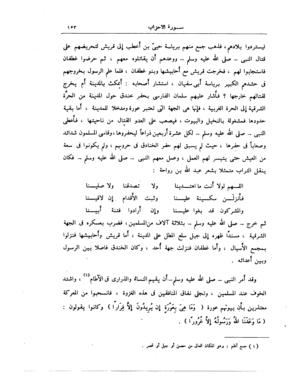 ليستردوا بلادهم، فذهب جمع منهم برياسة حييّ بن أخطب إلى قريش لتحريضهم على قتال النبي - صلى الله عليه وسلم - ووعدهم أن يقاتلوه معهم، ثم حرضوا غطفان فاستجابوا لهم، فخرجت قريش مع أحابيشها وبنو غطفان، فلما علم الرسول بخروجهم في حشدهم الكبير برياسة أبي سفيان، استشار أصحابه: أيمكث بالمدينة أم يخرج لقتالهم خارجها؟ فأَشار عليهم سلمان الفارسي بحفر خندق حول المدينة من الحرَّة الشرقية إلى الحرة الغربية، فإنها هي الجهة التي تعتبر عورة ومدخلا للمدينة، أما بقية حدودها فمشغولة بالنخيل والبيوت، فيصعب على العدو القتال من ناحيتها، فأعطى النبي - صلى الله عليه وسلم - لكل عشرة أربعين ذراعًا ليحفروها، وقاسى المسلمون شدائد وصعابًا في حفرها، حيث لم يسبق لهم حفر الخنادق في حروبهم، ولم يكونوا في سعة من العيش حتى يتيسر لهم العمل، وعمل معهم النبي - صلى الله عليه وسلم - فكان ينقل التراب متمثلا بشعر عبد الله بن رواحة: