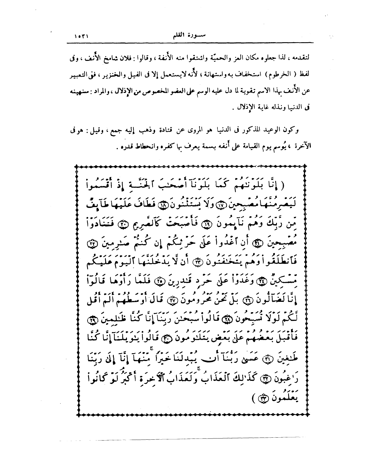 {إِنَّا بَلَوْنَاهُمْ كَمَا بَلَوْنَا أَصْحَابَ الْجَنَّةِ إِذْ أَقْسَمُوا لَيَصْرِمُنَّهَا مُصْبِحِينَ (17) وَلَا يَسْتَثْنُونَ (18) فَطَافَ عَلَيْهَا طَائِفٌ مِنْ رَبِّكَ وَهُمْ نَائِمُونَ (19) فَأَصْبَحَتْ كَالصَّرِيمِ (20) فَتَنَادَوْا مُصْبِحِينَ (21) أَنِ اغْدُوا عَلَى حَرْثِكُمْ إِنْ كُنْتُمْ صَارِمِينَ (22) فَانْطَلَقُوا وَهُمْ يَتَخَافَتُونَ (23) أَنْ لَا يَدْخُلَنَّهَا الْيَوْمَ عَلَيْكُمْ مِسْكِينٌ (24) وَغَدَوْا عَلَى حَرْدٍ قَادِرِينَ (25) فَلَمَّا رَأَوْهَا قَالُوا إِنَّا لَضَالُّونَ (26) بَلْ نَحْنُ مَحْرُومُونَ (27) قَالَ أَوْسَطُهُمْ أَلَمْ أَقُلْ لَكُمْ لَوْلَا تُسَبِّحُونَ (28) قَالُوا سُبْحَانَ رَبِّنَا إِنَّا كُنَّا ظَالِمِينَ (29) فَأَقْبَلَ بَعْضُهُمْ عَلَى بَعْضٍ يَتَلَاوَمُونَ (30) قَالُوا يَا وَيْلَنَا إِنَّا كُنَّا طَاغِينَ (31) عَسَى رَبُّنَا أَنْ يُبْدِلَنَا خَيْرًا مِنْهَا إِنَّا إِلَى رَبِّنَا رَاغِبُونَ (32) كَذَلِكَ الْعَذَابُ وَلَعَذَابُ الْآخِرَةِ أَكْبَرُ لَوْ كَانُوا يَعْلَمُونَ (33)}