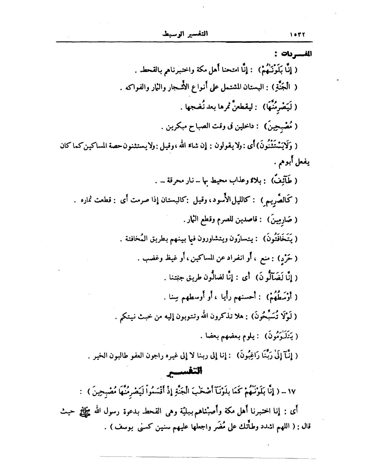 (إِنَّا بَلَوْنَاهُمْ): إِنَّا امتحنا أَهل مكة واختبرناهم بالقحط.