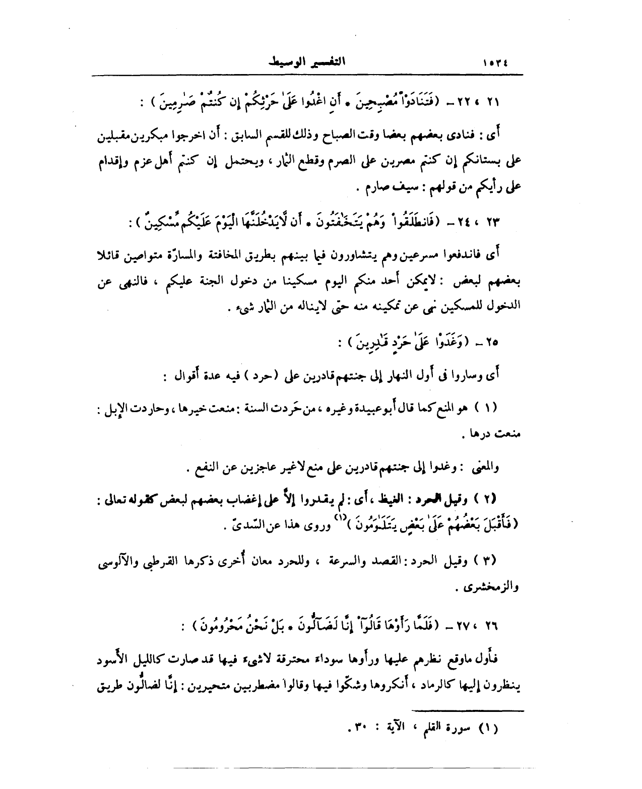 (3) وقيل الحرد: القصد والسرعة، وللحرد معان أُخرى ذكرها القرطبي والآلوسي والزمخشري.