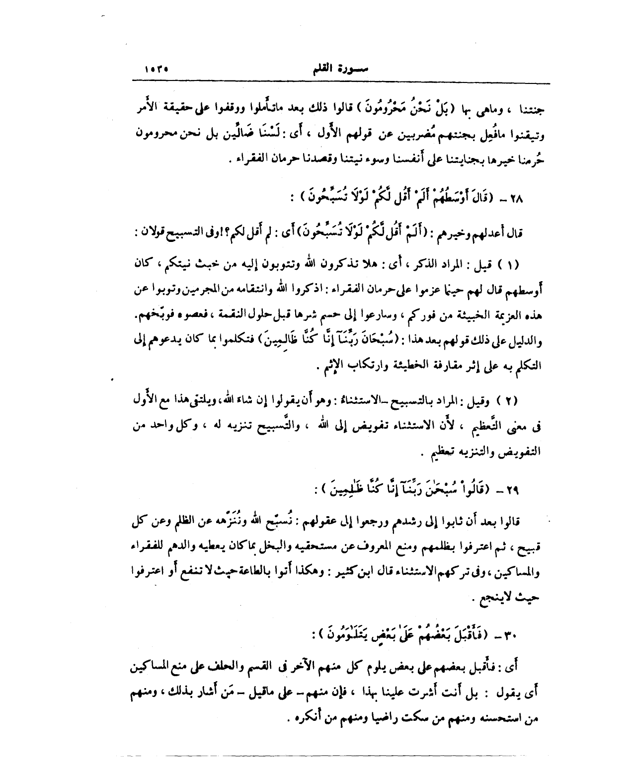 (1) قيل: المراد الذكر، أَي: هلا تذكرون الله وتتوبون إليه من خبث نيتكم، كان أَوسطهم قال لهم حينما عزموا على حرمان الفقراء: اذكروا الله وانتقامه من المجرمين وتوبوا عن هذه العزيمة الخبيثة من فوركم، وسارعوا إِلى حسم شرها قبل حلول النقمة، فعصوه فوبّخهم، والدليل على ذلك قولهم بعد هذا: (سُبْحَانَ رَبِّنَا إِنَّا كُنَّا ظَالِمِينَ) فتكلموا بما كان يدعوهم إِلى التكلم به على إِثر مقارفة الخطيئة وارتكاب الإِثم.