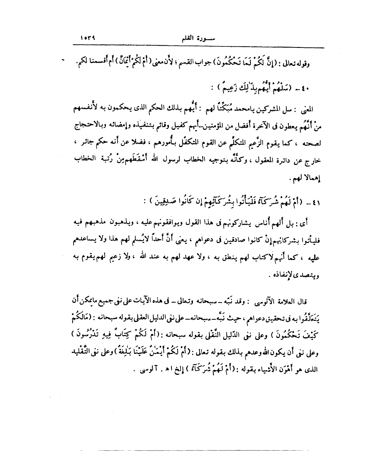 قال العلامة الآلوسي: وقد نَبّه - سبحانه وتعالى - في هذه الآيات على نفي جميع ما يمكن أن يَتَعَلَّقُوا به في تحقيق دعواهم، حيث نَبَّه - سبحانه - على نفي الدليل العقلي بقوله سبحانه: (مَا لَكُمْ كَيْفَ تَحْكُمُونَ) وعلى نفي الدّليل النَّقْلي بقوله سبحانه: (أَمْ لَكُمْ كِتَابٌ فِيهِ تَدْرُسُونَ) وعلى نفي أَن يكون الله وعدهم بذلك بقوله تعالى: (أَم لَكُمْ أَيْمَانٌ عَلَيْنَا بَلِغَةٌ) وعلى نفي التَّقْليد الذي هو أَهْوَن الأَشياء بقوله: (أَمْ لَهُمْ شُرَكَاءُ) الخ أهـ آلوسي.