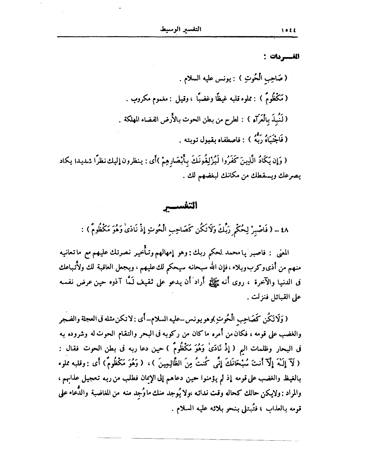 (وَلا تَكُنْ كَصَاحِبِ الْحُوتِ): وهو يونس - عليه السلام - أَي: لا تكن مثله في العجلة والضجر والغضب على قومه، فكان من أَمره ما كان من ركوبه في البحر والتقام الحوت له وشروده به في البحار وظلمات اليم (إِذْ نَادَى وَهُوَ مَكْظُومٌ) حين دعا ربه في بطن الحوت فقال: (أَنْ لَا إِلَهَ إِلَّا أَنْتَ سُبْحَانَكَ إِنِّي كُنْتُ مِنَ الظَّالِمِينَ)، (وَهُوَ مَكْظُومٌ) أَي: وقلبه مملوء بالغيظ والغضب على قومه) أَي: وقلبه مملوء بالغيظ والغضب على قومه إِذ لم يؤمنوا حين دعاهم إلي الإِيمان فطلب من ربه تعجيل عذابهم، والمراد: ولا يكن حالك كحاله وقت ندائه، ولا يُوجد منك ما وُجِد منه من المغاضبة والدُّعاء على قومه بالعذاب؛ فتُبتلى بنحو بلائه عليه السلام.