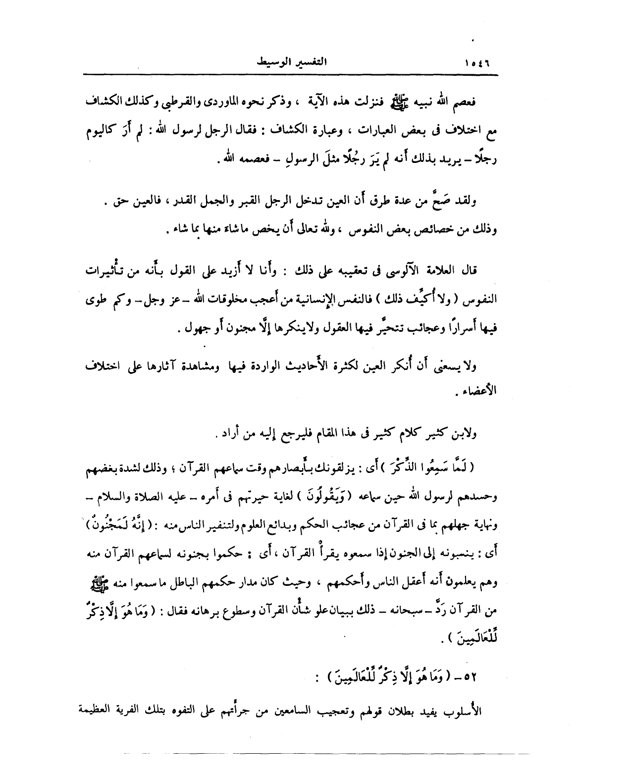فعصم الله نبيه صلى الله عليه وسلم فنزلت هذه الآية، وذكر نحوه الماوردي والقرطبي وكذلك الكشاف مع اختلاف في بعض العبارات، وعبارة الكشاف: فقال الرجل لرسول الله: لم أَرَ كاليوم رجلًا - يريد بذلك أَنه لم يَرَ رجُلًا مثلَ الرسولِ - فعصمه الله.