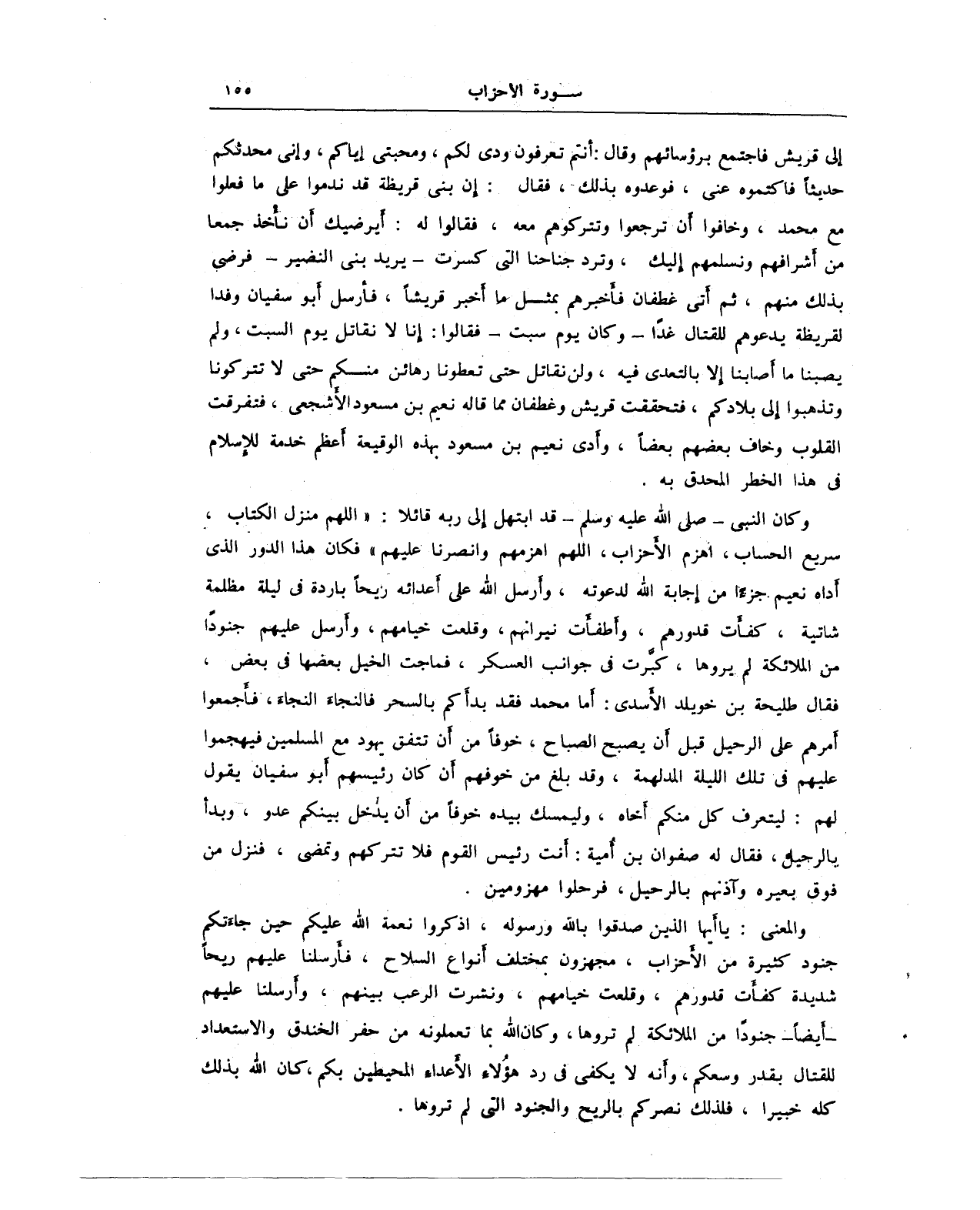 وكان النبي - صلى الله عليه وسلم - قد ابتهل إلى ربه قائلا: "اللهم منزل الكتاب، سريع الحساب، اهزم الأَحزاب، اللهم اهزمهم وانصرنا. عليهم" فكان هذا الدور الذي أداه نعيم جزءًا من إجابة الله لدعوته، وأرسل الله على أعدائه ريحًا باردة في ليلة مظلمة شاتية، كفأت قدورهم، وأطفأَت نيرانهم، وقلعت خيامهم، وأَرسل عليهم جنودًا من الملائكة لم يروها، كبَّرت في جوانب العسكر، فماجت الخيل بعضها في بعض، فقال طليحة بن خويلد الأَسدى: أما محمَّد فقد بدأكم بالسحر فالنجاءَ النجاء. فأَجمعوا أَمرهم على الرحيل قبل أن يصبح الصباح، خوفًا من أن تتفق يهود مع المسلمين فيهجموا عليهم في تلك الليلة المدلهمة، وقد بلغ من خوفهم أن كان رئيسهم أبو سفيان يقول لهم: ليتعرف كل منكم أخاه، وليمسك بيده خوفًا من أن يدخل بينكم عدو، وبدأ بالرحيل، فقال له صفوان بن أُمية: أنت رئيس القوم فلا تتركهم وتمضى، فنزل من فوق بعيره وآذنهم بالرحيل، فرحلوا مهزومين. والمعنى: يا أَيها الذين صدقوا باللهِ ورسوله، اذكروا نعمة الله عليكم حين جاءتكم جنود كثيرة من الأَحزاب، مجهزون بمختلف أنواع السلاح، فأَرسلنا عليهم ريحًا شديدة كفأَت قدورهم، وقلعت خيامهم، ونشرف الرعب بينهم، وأرسلنا عليهم - أيضًا - جنودًا من الملائكة لم تروها، وكان الله بما تعملونه من حفر الخندق والاستعداد للقتال بقدر وسعكم، وأنه لا يكفي في رد هؤُلاء الأَعداء المحيطين بكم، كان الله بذلك كله خبيرا، فلذلك نصركم بالريح والجنود التي لم تروها.