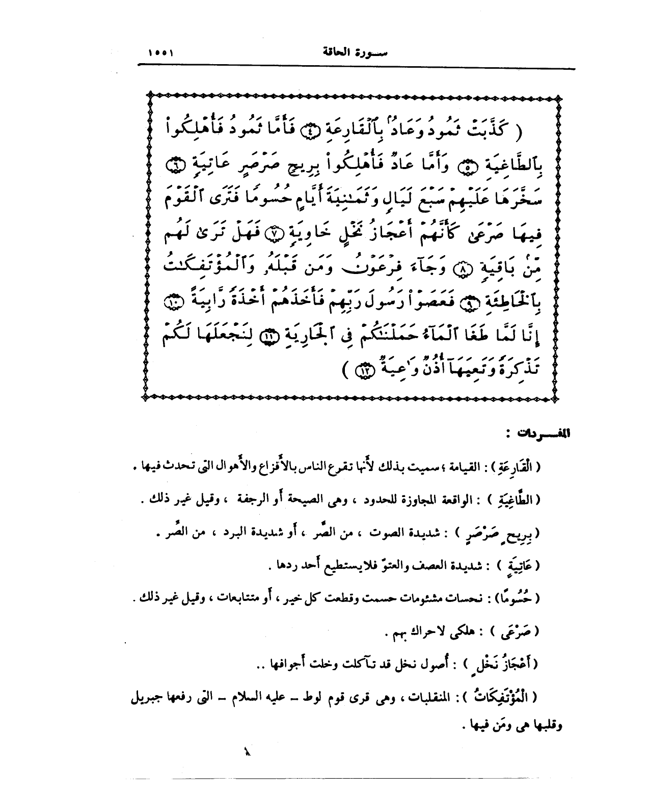 {كَذَّبَتْ ثَمُودُ وَعَادٌ بِالْقَارِعَةِ (4) فَأَمَّا ثَمُودُ فَأُهْلِكُوا بِالطَّاغِيَةِ (5) وَأَمَّا عَادٌ فَأُهْلِكُوا بِرِيحٍ صَرْصَرٍ عَاتِيَةٍ (6) سَخَّرَهَا عَلَيْهِمْ سَبْعَ لَيَالٍ وَثَمَانِيَةَ أَيَّامٍ حُسُومًا فَتَرَى الْقَوْمَ فِيهَا صَرْعَى كَأَنَّهُمْ أَعْجَازُ نَخْلٍ خَاوِيَةٍ (7) فَهَلْ تَرَى لَهُمْ مِنْ بَاقِيَةٍ (8) وَجَاءَ فِرْعَوْنُ وَمَنْ قَبْلَهُ وَالْمُؤْتَفِكَاتُ بِالْخَاطِئَةِ (9) فَعَصَوْا رَسُولَ رَبِّهِمْ فَأَخَذَهُمْ أَخْذَةً رَابِيَةً (10) إِنَّا لَمَّا طَغَى الْمَاءُ حَمَلْنَاكُمْ فِي الْجَارِيَةِ (11) لِنَجْعَلَهَا لَكُمْ تَذْكِرَةً وَتَعِيَهَا أُذُنٌ وَاعِيَةٌ (12)}