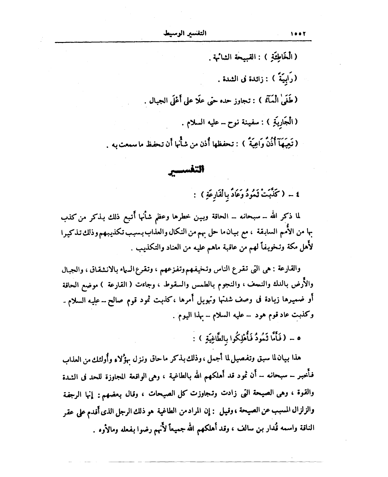 هذا بيان لما سبق وتفصيل لما أَجمل، وذلك ذكر ما حاق ونزل بهؤُلاءِ وأُولئك من العذاب فأَخبر - سبحانه - أَن ثمود قد أَهلكهم الله بالطاغية، وهي الواقعة المجاوزة للحد في الشدة والقوة، وهي الصيحة التي زادت وتجاوزت كل الصيحات، وقال بعضهم: إِنها الرجفة والزلزال المسبب عن الصيحة، وقيل: إِن المراد من الطاغية هو ذلك الرجل الذي أَقدم على عقر الناقة واسمه قُدار بن سالف، وقد أَهلكهم الله جميعا لأَنهم رضوا بفعله ومالأوه.