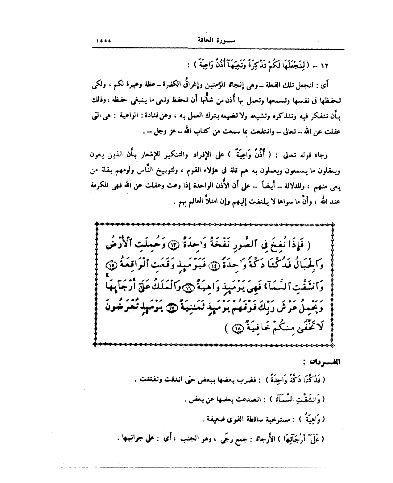 {فَإِذَا نُفِخَ فِي الصُّورِ نَفْخَةٌ وَاحِدَةٌ (13) وَحُمِلَتِ الْأَرْضُ وَالْجِبَالُ فَدُكَّتَا دَكَّةً وَاحِدَةً (14) فَيَوْمَئِذٍ وَقَعَتِ الْوَاقِعَةُ (15) وَانْشَقَّتِ السَّمَاءُ فَهِيَ يَوْمَئِذٍ وَاهِيَةٌ (16) وَالْمَلَكُ عَلَى أَرْجَائِهَا وَيَحْمِلُ عَرْشَ رَبِّكَ فَوْقَهُمْ يَوْمَئِذٍ ثَمَانِيَةٌ (17) يَوْمَئِذٍ تُعْرَضُونَ لَا تَخْفَى مِنْكُمْ خَافِيَةٌ (18)}