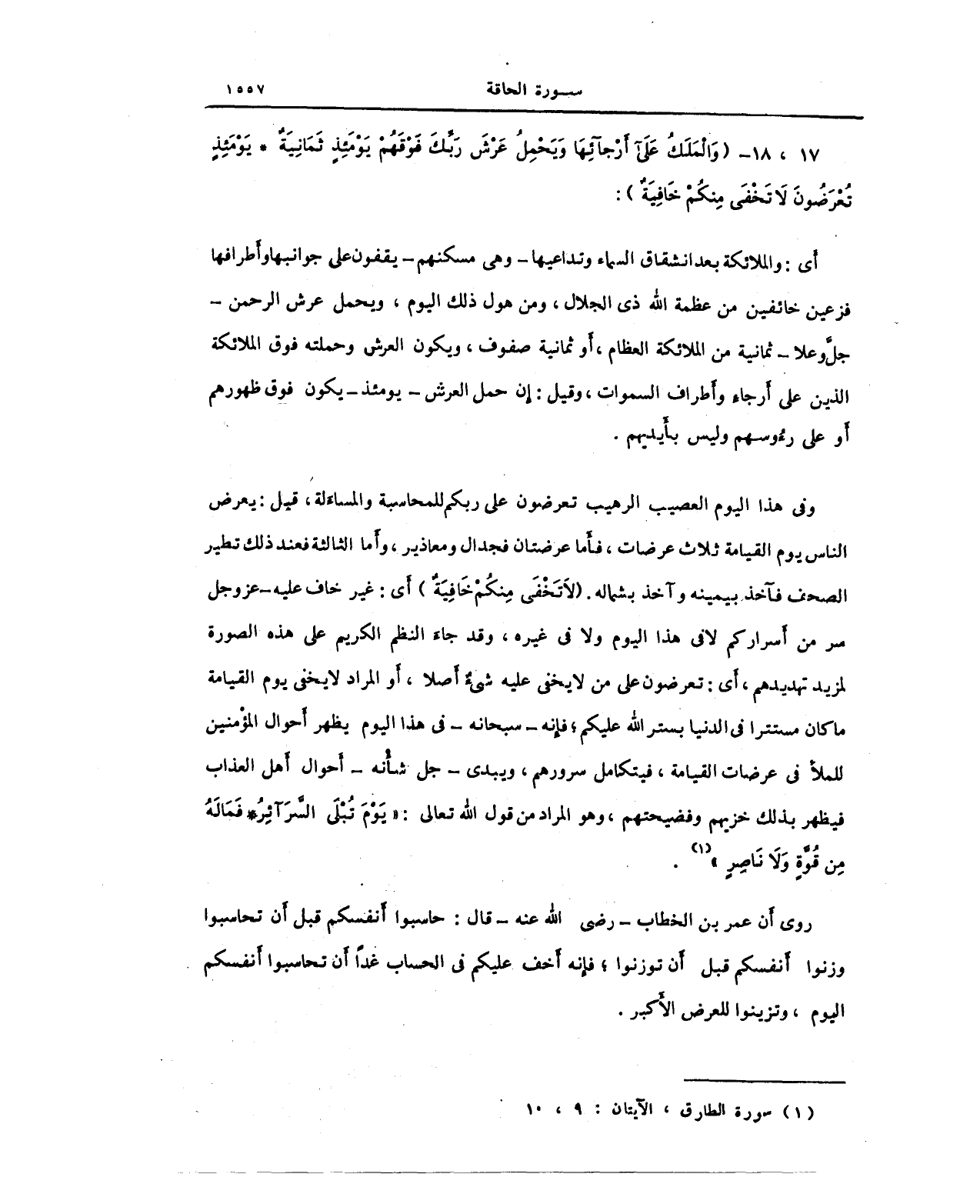 روي أَن عمر بن الخطاب - رضي الله عنه - قال: حاسبوا أَنفسكم قبل أن تحاسبوا وزنوا أَنفسكم قبل أن توزنوا؛ فإِنه أَخف عليكم في الحساب غدًا أَن تحاسبوا أَنفسكم اليوم، وتزينوا للعرض الأَكبر.