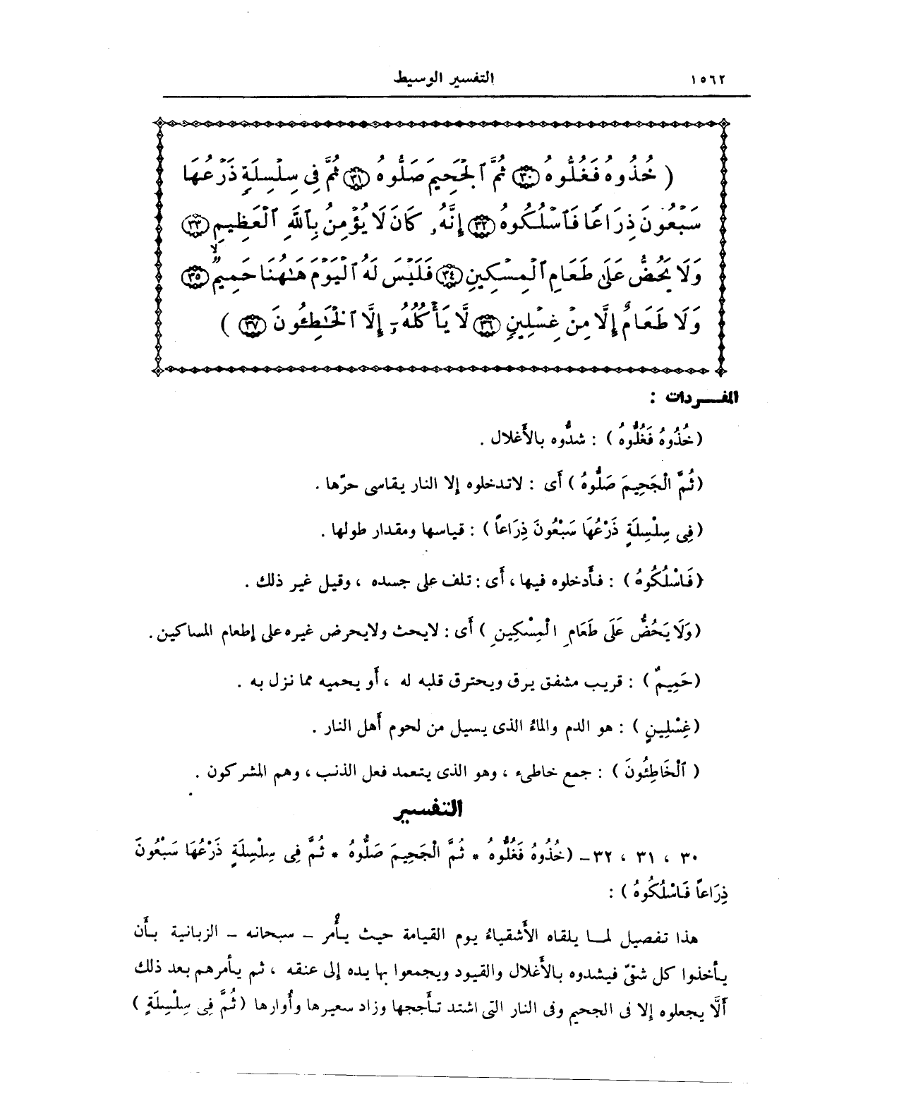 هذا تفصيل لما يلقاه الأَشقياءُ يوم القيامة حيث يأمر - سبحانه - الزبانية بأَن يأخذوا كل شقيّ فيشدوه بالأَغلال والقيود ويجمعوا بها يده إِلى عنقه، ثم يأمرهم بعد ذلك أَلاَّ يجعلوه إِلا في الجحيم وفي النار التي اشتد تأَججها وزاد سعيرها وأُوارها (ثُمَّ فِي سِلْسِلَةٍ)