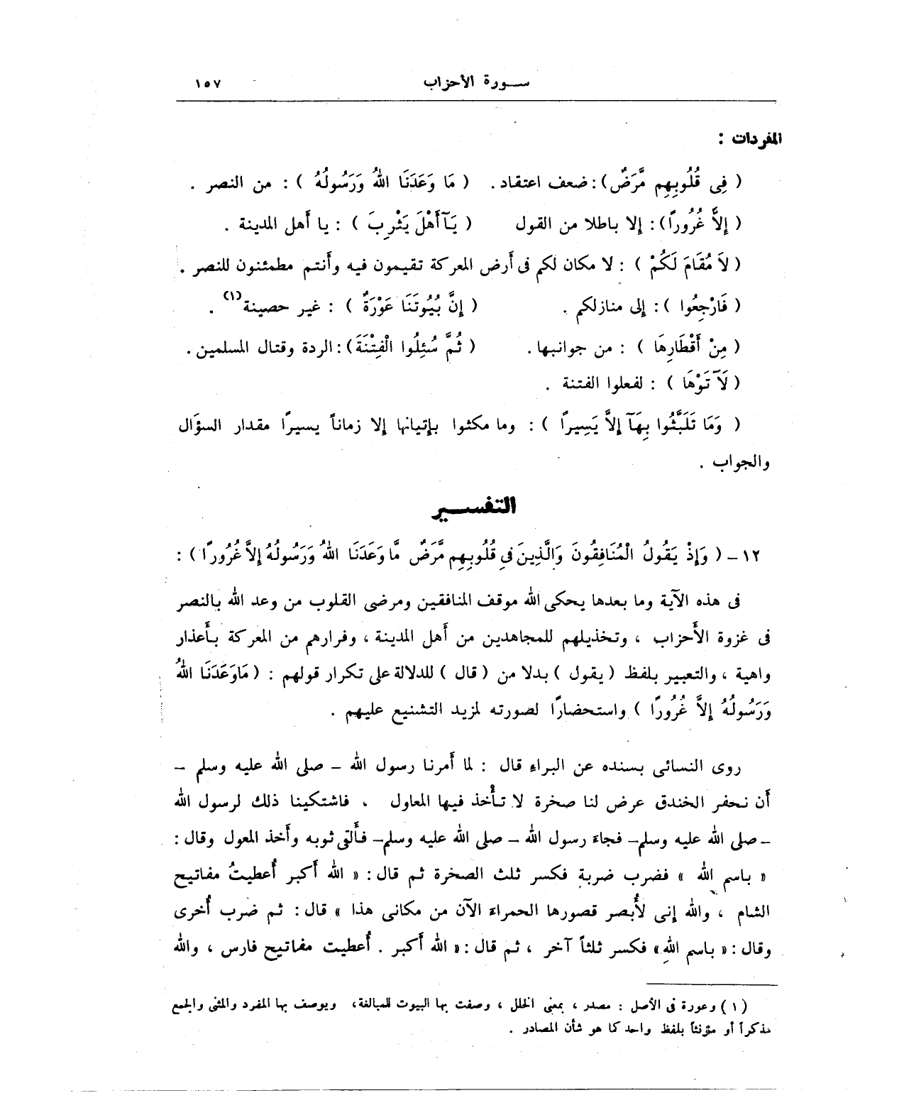 12 - {وَإِذْ يَقُولُ الْمُنَافِقُونَ وَالَّذِينَ فِي قُلُوبِهِمْ مَرَضٌ مَا وَعَدَنَا اللَّهُ وَرَسُولُهُ إِلَّا غُرُورًا}: