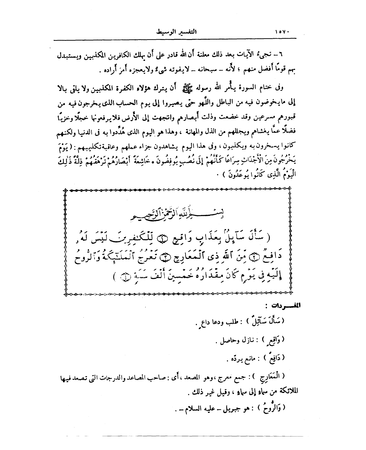 {سَأَلَ سَائِلٌ بِعَذَابٍ وَاقِعٍ (1) لِلْكَافِرِينَ لَيْسَ لَهُ دَافِعٌ (2) مِنَ اللَّهِ ذِي الْمَعَارِجِ (3) تَعْرُجُ الْمَلَائِكَةُ وَالرُّوحُ إِلَيْهِ فِي يَوْمٍ كَانَ مِقْدَارُهُ خَمْسِينَ أَلْفَ سَنَةٍ (4)}