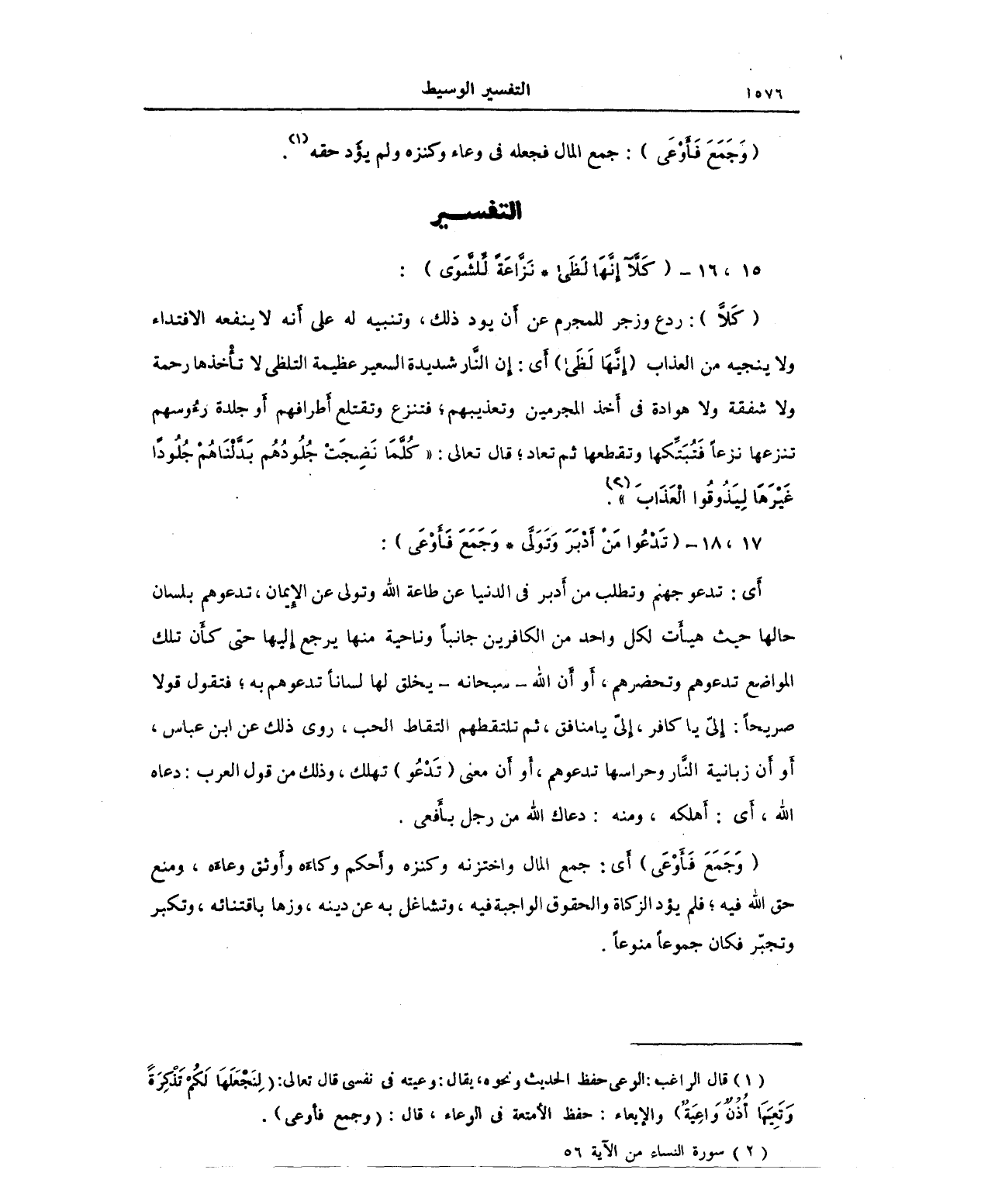 (¬1) قال الراغب: الوعي حفظ الحديث ونحوه، يقال: وعيته في نفسي قال تعالى: {لِنَجْعَلَهَا لَكُمْ تَذْكِرَةً وَتَعِيَهَا أُذُنٌ وَاعِيَةٌ} والإيعاء: حفظ الأمتعة في الوعاء، قال: (وجمع فأوعى).