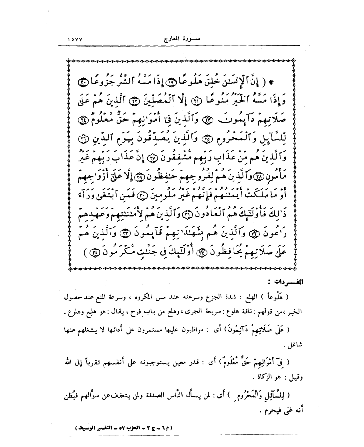 * {إِنَّ الْإِنْسَانَ خُلِقَ هَلُوعًا (19) إِذَا مَسَّهُ الشَّرُّ جَزُوعًا (20) وَإِذَا مَسَّهُ الْخَيْرُ مَنُوعًا (21) إِلَّا الْمُصَلِّينَ (22) الَّذِينَ هُمْ عَلَى صَلَاتِهِمْ دَائِمُونَ (23) وَالَّذِينَ فِي أَمْوَالِهِمْ حَقٌّ مَعْلُومٌ (24) لِلسَّائِلِ وَالْمَحْرُومِ (25) وَالَّذِينَ يُصَدِّقُونَ بِيَوْمِ الدِّينِ (26) وَالَّذِينَ هُمْ مِنْ عَذَابِ رَبِّهِمْ مُشْفِقُونَ (27) إِنَّ عَذَابَ رَبِّهِمْ غَيْرُ مَأْمُونٍ (28) وَالَّذِينَ هُمْ لِفُرُوجِهِمْ حَافِظُونَ (29) إِلَّا عَلَى أَزْوَاجِهِمْ أَوْ مَا مَلَكَتْ أَيْمَانُهُمْ فَإِنَّهُمْ غَيْرُ مَلُومِينَ (30) فَمَنِ ابْتَغَى وَرَاءَ ذَلِكَ فَأُولَئِكَ هُمُ الْعَادُونَ (31) وَالَّذِينَ هُمْ لِأَمَانَاتِهِمْ وَعَهْدِهِمْ رَاعُونَ (32) وَالَّذِينَ هُمْ بِشَهَادَاتِهِمْ قَائِمُونَ (33) وَالَّذِينَ هُمْ عَلَى صَلَاتِهِمْ يُحَافِظُونَ (34)}