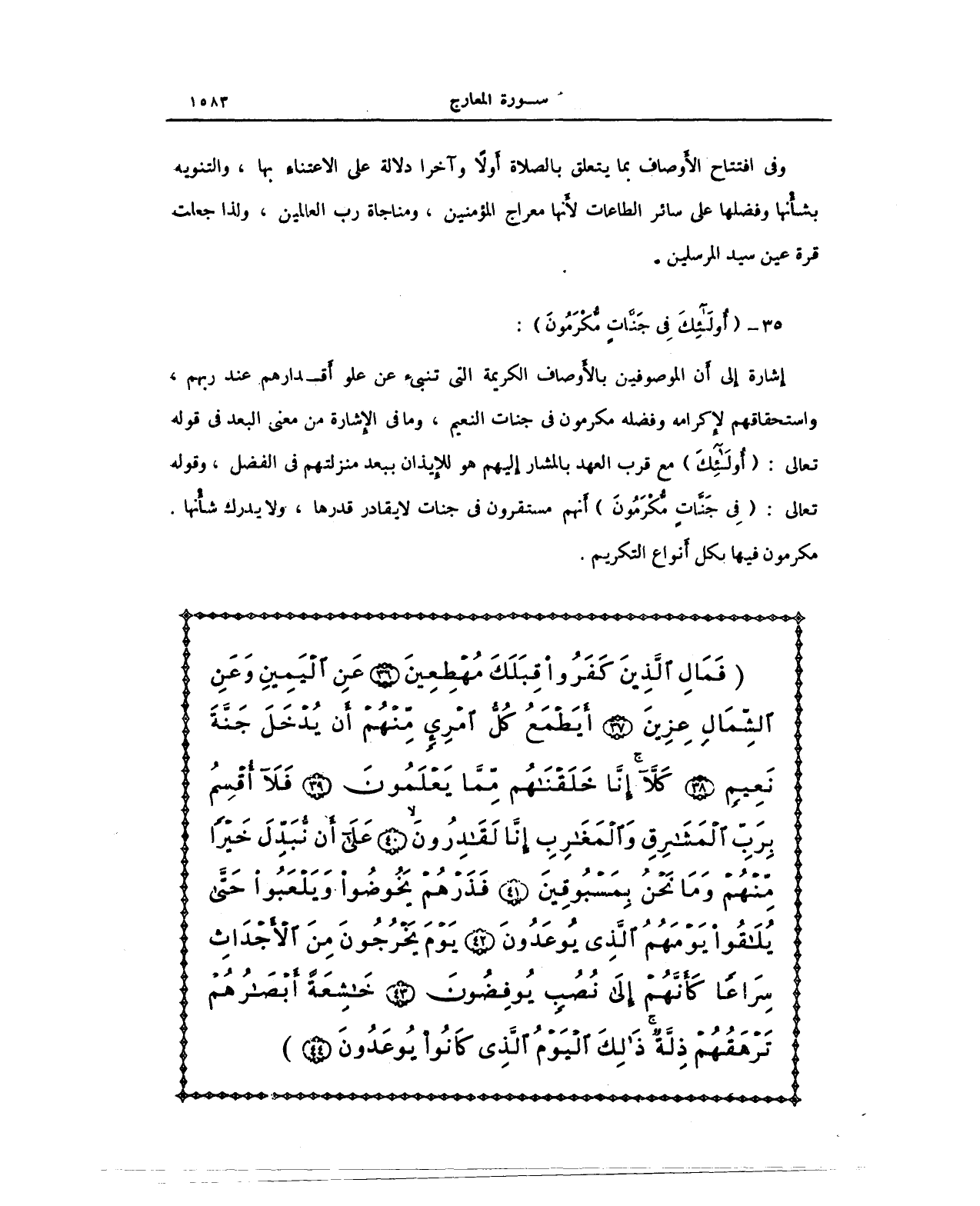 إِشارة إِلى أَن الموصوفين بالأَوصاف الكريمة التي تنبيء عن علو أَقدارهم عند ربهم، واستحقاقهم لإِكرامه وفضله مكرمون في جنات النعيم، وما في الإِشارة من معنى البعد في قوله تعالى: (فِي جَنَّاتٍ مُكْرَمُونَ) أَنهم مستقرون في جنات لا يقادر قدرها، ولا يدرك شأَنها. مكرمون فيها بكل أَنواع التكريم.