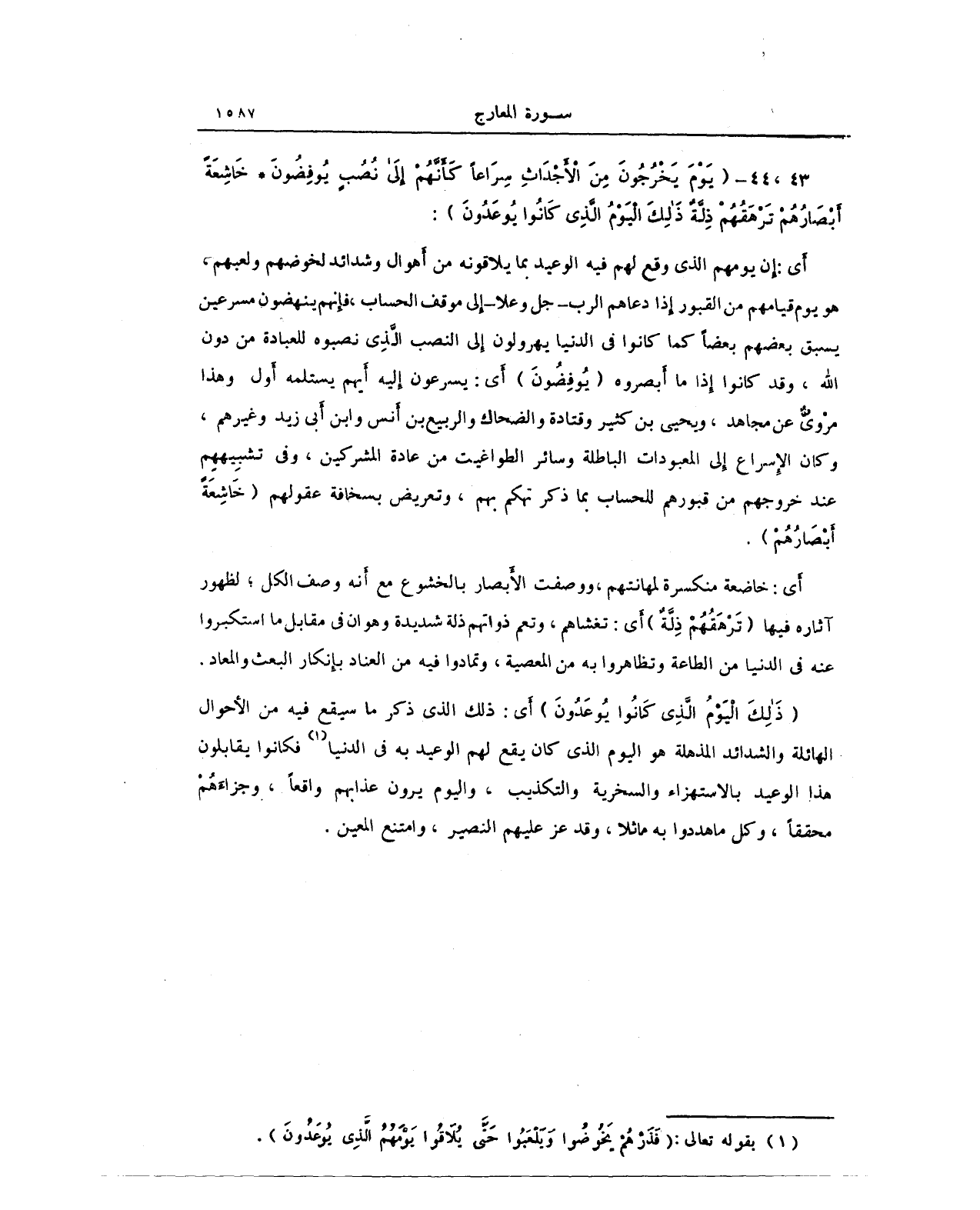 أَي: إِن يومهم الذي وقع لهم فيه الوعد بما يلاقونه من أَهوال وشدائد لخوضهم ولعبهم، هو يوم قيامهم من القبور إِذا دعاهم الرب - جل وعلا - إِلى موقف الحساب، فإِنهم ينهضون مسرعين يسبق بعضهم بعضًا كما كانوا في الدنيا يهرولون إِلى النصب الَّذي تصبوه للعباده من دون الله، وقد كانوا إذا ما أَبصروه (يُوفِضُونَ) أَي: يسرعون إِليه أَيهم يستلمه أَول وهذا مرْويٌّ عن مجاهد، ويحيى بن كثير وقتادة والضحاك والربيع بن أَنس وابن أَبي زيد وغيرهم وكان الإِسراع إِلى المعبودات الباطلة وسائر الطواغيت من عادة المشركين، وفي تشبيههم عند خروجهم من قبورهم للحساب بما ذكر تهكم بهم، وتعريض بسخافة عقولهم (خَاشِعَةً أَبْصَارُهُمْ).