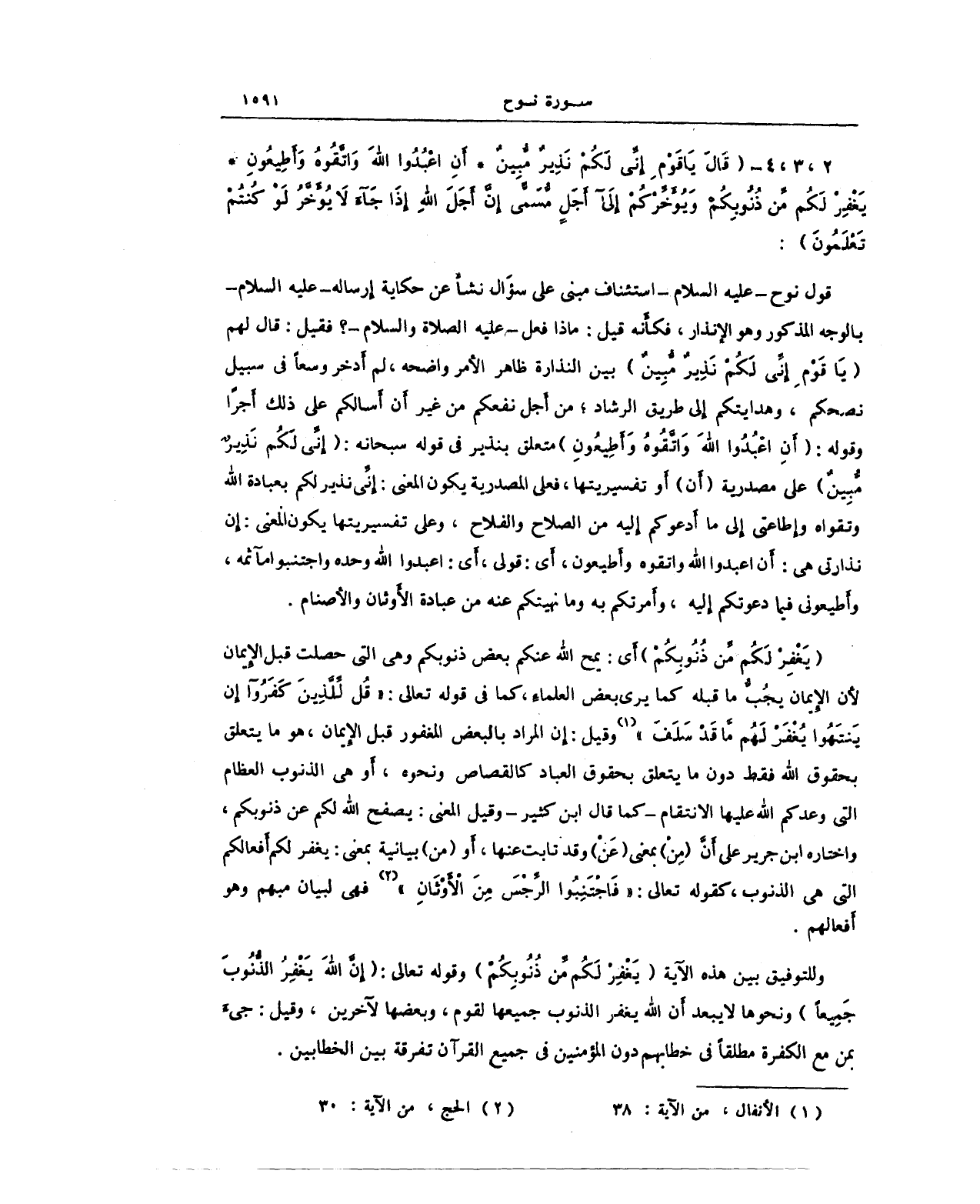 4،3،2 - {قَالَ يَا قَوْمِ إِنِّي لَكُمْ نَذِيرٌ مُبِينٌ (2) أَنِ اعْبُدُوا اللَّهَ وَاتَّقُوهُ وَأَطِيعُونِ (3) يَغْفِرْ لَكُمْ مِنْ ذُنُوبِكُمْ وَيُؤَخِّرْكُمْ إِلَى أَجَلٍ مُسَمًّى إِنَّ أَجَلَ اللَّهِ إِذَا جَاءَ لَا يُؤَخَّرُ لَوْ كُنْتُمْ تَعْلَمُونَ (4)}