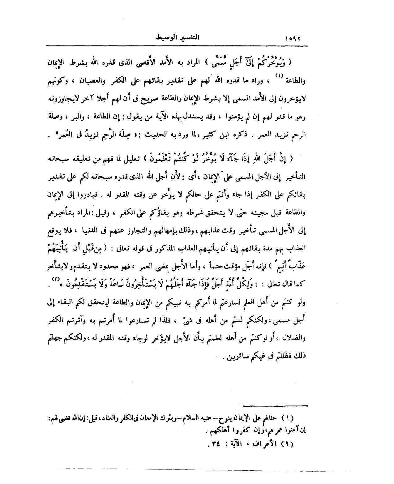 (وَيُؤَخِّرْكُمْ إِلَى أَجَلٍ مُسَمًّى) المراد به الأَمد الأَقصى الذي قدره الله بشرط الإِيمان والطاعة (¬1) وراءَ ما قدره الله لهم على تقدير بقائهم على الكفر والعصيان، وكونهم لا يؤخرون إِلى الأَمد المسمى إِلا بشرط الإِيمان والطاعة صريح في أَن لهم أَجلا آخر لا يجاوزونه وهو ما قدر لهم إِن لم يؤمنوا، وقد يستدل بهذه الآية من يقول: إِن الطاعة، والبر، وصلة الرحم تزيد العمر. ذكره ابن كثير، لما ورد به الحديث: (صِلَة الرَّحِم تزيدُ في العُمر).