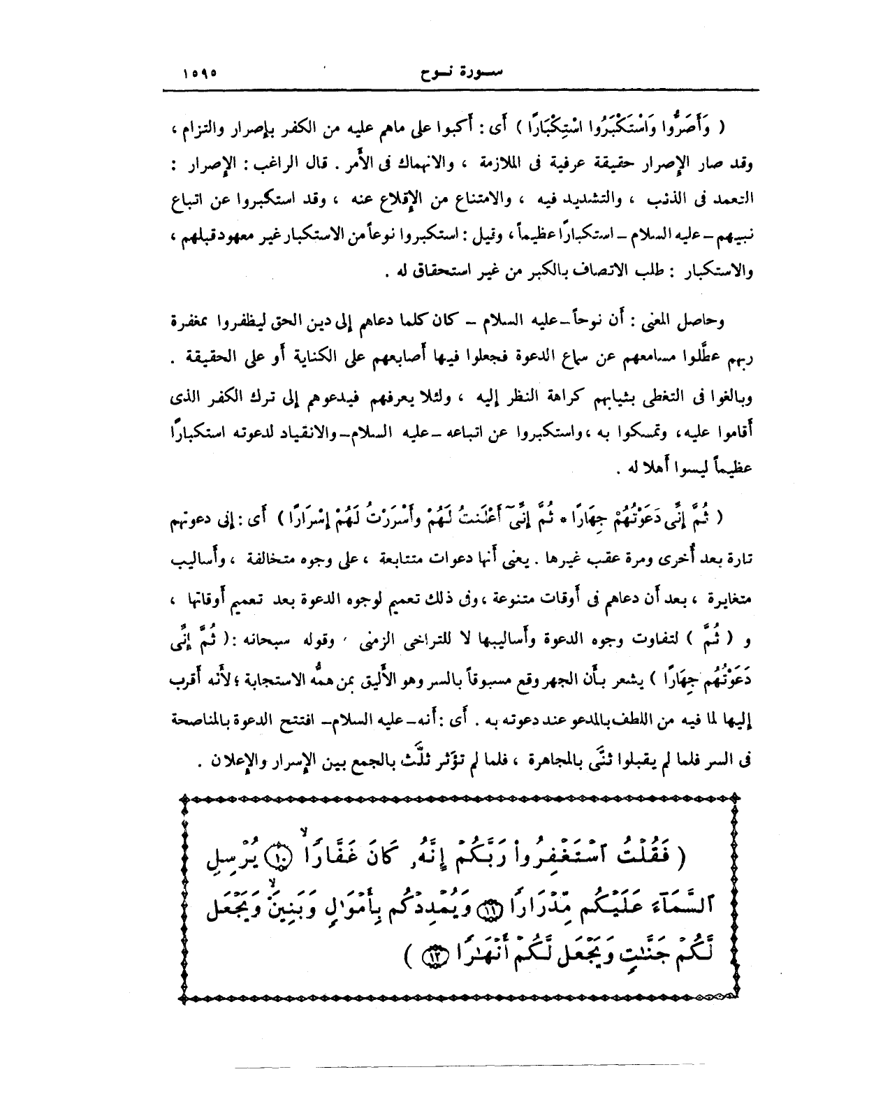 {ثُمَّ إِنِّي دَعَوْتُهُمْ جِهَارًا (8) ثُمَّ إِنِّي أَعْلَنْتُ لَهُمْ وَأَسْرَرْتُ لَهُمْ إِسْرَارًا (9)} أَي: إِني دعوتهم تارة بعد أُخرى ومرة عقب غيرها. يعني أَنها دعوات متتابعة، على وجوه متخالفة، وأَساليب متغايرة، بعد أَن دعاهم في أَوقات متنوعة، وفي ذلك تعميم لوجوه الدعوة بعد تعميم أَوقاتها، و (ثُمَّ) لتفاوت وجوه الدعوة وأَساليبها لا للتراخي الزمني وقوله سبحانه: (ثُمَّ إِنِّي دَعَوْتُهُمْ جِهَارًا) يشعر بأَن الجهر وقع مسبوقًا بالسر وهو الأليق بمن همُّه الاستجابة؛ لأَنه أَقرب إِليها لما فيه من اللطف بالمدعو عند دعوته به: أَي: أَنه - عليه السلام - افتتح الدعوة بالمناصحة في السر فلما لم يقبلوا ثنَّى بالمجاهرة، فلما لم تؤَثر ثلَّث بالجمع بين الإِسرار والإِعلان.