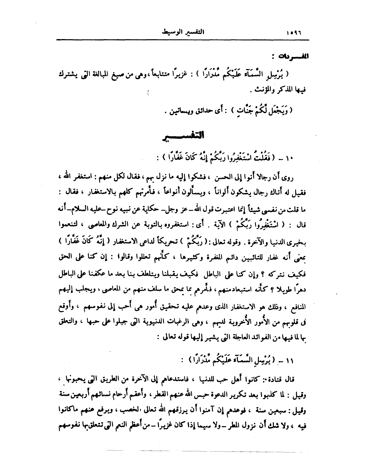 روي أَن رجالا أَتوا إلي الحسن، فشكوا إِليه ما نزل بهم، فقال لكل منهم: استغفر الله، وفقيل له أَتاك رجال يشكون أَلوانًا، ويسأَلون أَنواعًا، فأَمرتهم كلهم بالاستغفار، فقال: ما قلت من نفسي شيئًا إنما اعتبرت قول الله - عز وجل - حكاية عن نبيه نوح - عليه السلام - أَنه قال: (اسْتَغْفِرُوا رَبَّكُمْ) الآية. أَي: استغفروه بالتوبة عن الشرك والمعاصي، لتنعموا بخيري الدنيا والآخرة. وقوله تعالى: (رَبَّكُمْ) تحريكًا لداعي الاستغفار (إِنَّهُ كَانَ غَفَّارًا) بمعنى أنه غفار للتائبين دائم المغفرة وكثيرها، كأَنهم تعالوا قالوا: إِن كنا على الحق فكيف نتركه؟ وإِن كنا على الباطل فكيف يقبلنا ويتلطف بنا بعد ما عكفنا على الباطل دهرًا طويلا؟ كأَنه استبعاد منهم، فأَمرهم بما يمحق ما سلف منهم من المعاصي، ويجلب إِليهم النافع، وذلك هو الاستغفار الذي وعدهم عليه تحقيق أُمور هي أَحب إِلى نفوسهم، وأَوقع في قلوبهم من الأمور الأُخروية لديهم، وهي الرغبات الدنيوية التي جبلوا على حبها، والتعلق بها لما فيها من الفوائد العاجلة التي يشير إِليها قوله تعالى: