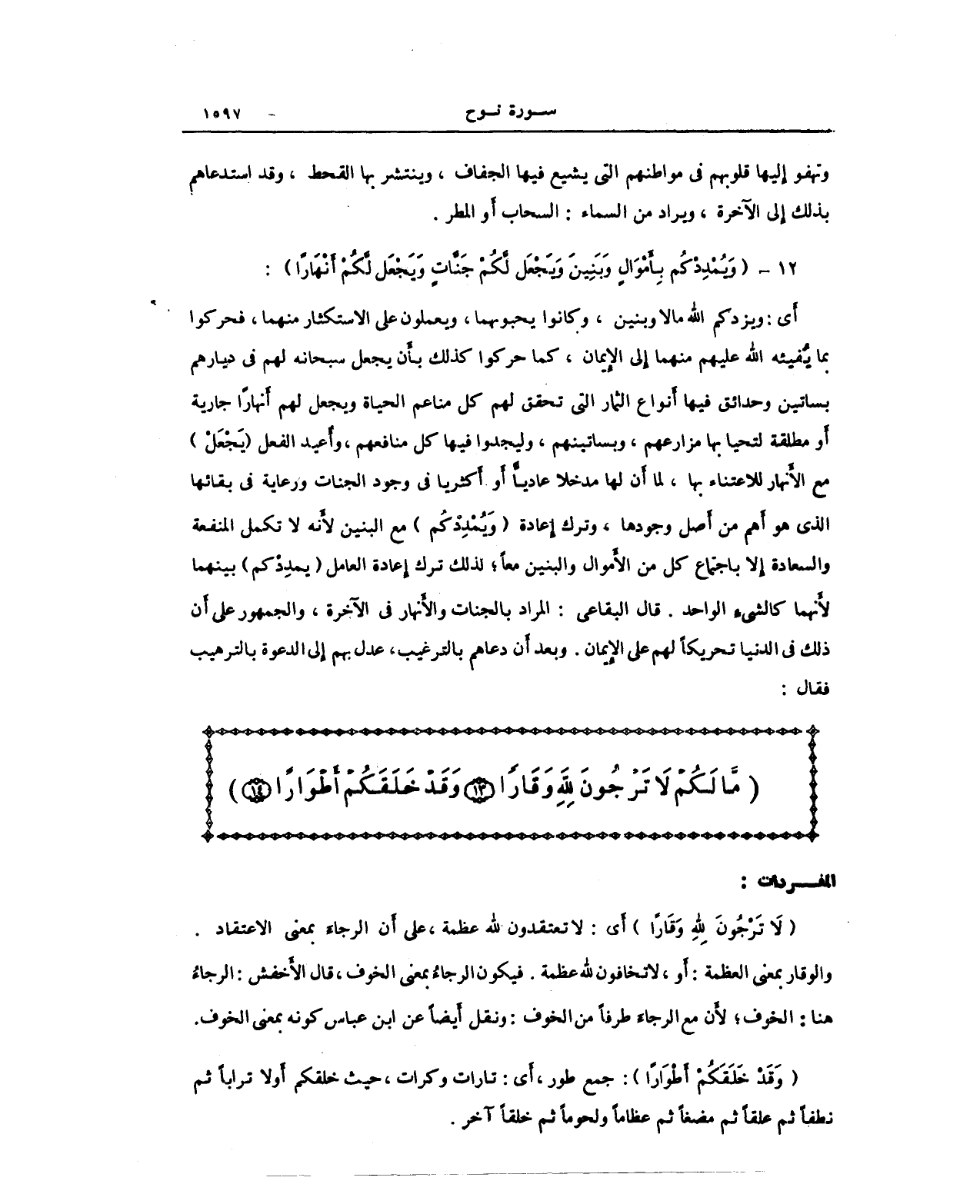 أَي: ويزدكم الله مالا وبنين، وكانوا يحبوهما، ويعلمون على الاستكثار منهما، فحركوا بما يُفيئه الله عليهم منها إِلى الإيمان، كما حركوا كذلك بأن يجعل سبحانه لهم في ديارهم بساتين وحدائق فيها أَنواع الثمار التي تحقق لهم كل مناعم الحياة ويجعل لهم أَنهارًا جارية أَو مطلقة لتحيا بها مزارعهم، وبساتينهم، وليجدوا فيها كل منافعهم، وأَعيد الفعل (يَجْعَلْ) مع الأَنهار للاعتناء بها، لما أَن لها مدخلا عاديًّا أَو أَكثريا في وجود الجنات ورعاية في بقائها الذي هو أَهم من أَصل وجودها، وترك إِعادة (وَيُمْدِدْكُمْ) مع البنين لأَنه لا تكمل المنفعة والسعادة إلا باجتماع كل من الأَموال والبنين معًا؛ لذلك ترك إِعادة العامل (يُمْدِدْكُمْ) بينهما لأَنهما كالشيءِ الواحد. قال البقاعي: المراد بالجنات والأَنهار في الآخرة، والجمهور على أَن ذلك في الدنيا تحريكًا لهم على الإِيمان. وبعد أَن دعاهم بالترغيب، عدل بهم إِلى الدعوة بالترهيب فقال: