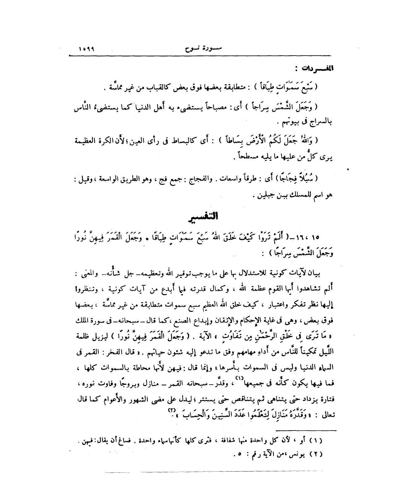 بيان الآيات كونية للاستدلال بها على ما يوجب توقير الله وتعظيمه - جل شأَنه - والمعنى: أَلم تشاهدوا أَيها القوم عظمة الله، وكمال قدرته فيما أَبدع من آيات كونية، وتنظروا إِليها نظر تفكر واعتبار، كيف خلق الله العظيم سبع سموات متطابقة من غير مماسَّة، بعضها فوق بعض، وهي في غاية الإِحكام والإِتقان وإِبداع الصنع، كما قال - سبحانه - في سورة الملك (مَا تَرىَ فيِ خَلْقِ الرَّحْمَنِ مِن تَفَاوُت) الآية (وَجَعَلَ الْقَمَرَ فِيهِنَّ نُورًا) ليزيل ظلمة اللَّيل تمكينًا للنَّاس من أَداءِ مهامهم وفق ما تدعوا إِليه شئون حياتهم. "قال الفخر: القمر في السماءِ الدنيا وليس في السموات بأَسرها" وإِنما قال: فيهن لأَنها محاطة بالسموات كلها، فما فيها يكون كأنه في جميعها (¬1)، وقدَّر - سبحانه القمر - منازل وبروجًا وفاوت نوره، فتارة يزداد حتى يتناهى ثم يتناقص حتى يستتر؛ ليدل على مضي الشهور والأَعوام كما قال تعالى: (وَقَدَّرَهُ مَنَازِلَ لِتَعْلَمُوا عَدَدَ السِّنِينَ وَالْحِسَابَ) (¬2).