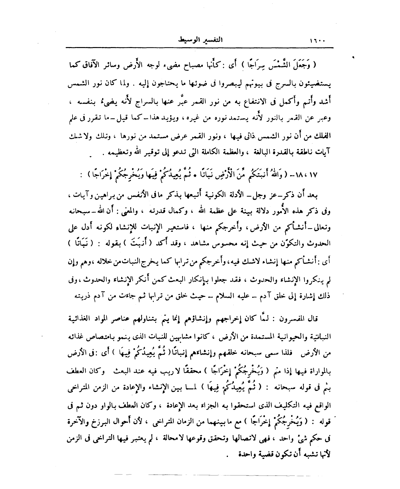 قال المفسرون: لمَّا كان إِخراجهم وإِنشاؤهم إِنما يتم بتناولهم عناصر المواد الغذائية النباتية والحيوانية المستمدة من الأَرض، كانوا مشابهين للنبات الذي ينمو بامتصاص غذائه من الأَرض فلذا سمى سبحانه خلقهم وإِنشاءَهم إِنباتًا (ثُمَّ يُعِيدُكُمْ فِيهَا) أَي: في الأَرض بالمواراة فيها إذا متم (وَيُخْرِجُكُمْ إِخْرَاجًا) محققًا لا ريب فيه عند البعث وكان العطف بثم في قوله سبحانه: (ثُمَّ يُعِيدُكُمْ فِيهَا) لما بين الإِنشاء والإعادة من الزمن المتراخي الواقع فيه التكليف الذي استحقوا به الجزاءَ بعد الإِعادة، وكان العطف بالواو دون ثم في قوله: (وَيُخْرِجُكُمْ إِخْرَاجًا) مع ما بينهما من الزمان المتراخي، لأَن أَحوال البرزخ والآخرة في حكم شيء واحد، فهي لاتصالها وتحقق وقوعها لا محالة، لم يعتبر فيها التراخي في الزمن لأَنها تشبه أَن تكون قضية واحدة.