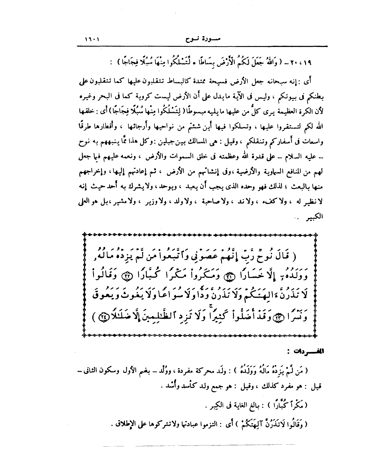 أَي: إِنه سبحانه جعل الأَرض فسيحة ممتدة كالبساط تتقلبون عليها كما تتقلبون على بطنكم في بيوتكم، وليس في الآية ما يدل على أَن الأَرض ليست كروية كما في البحر وغيره لأَن الكرة العظيمة يري كلُّ من عليها ما يليه مبسوطًا (لِتَسْلُكُوا مِنْهَا سُبُلًا فِجَاجًا) أَي: خلقها الله لكم لتسقروا عليها، وتسلكوا فيها أَين شئتم من نواحيها وأَرجائها، وأَقطارها طرقًا واسعات في أَسفاركم وتنقلكم، وقيل: هي المسالك بين جبلين: وكل هذا ممَّا ينبههم به نوح - عليه السلام - على قدرة الله وعظمته في خلق السموات والأَرض، ونعمة عليهم فيما جعل لهم من المنافع السماوية والأَرضية، وفي إِنشائهم من الأَرض، ثم إِعادتهم إِليها، وإِخراجهم منها بالبعث؛ لذلك فهو وحده الذي يجب أَن يعبد، ويوجد ولا يشرك به أَحد حيث إِنه لا نظير له، ولا كفء، ولا ند، ولا صاحبه، ولا ولد، ولا وزير، ولا مشير، بل هو العلي الكبير.