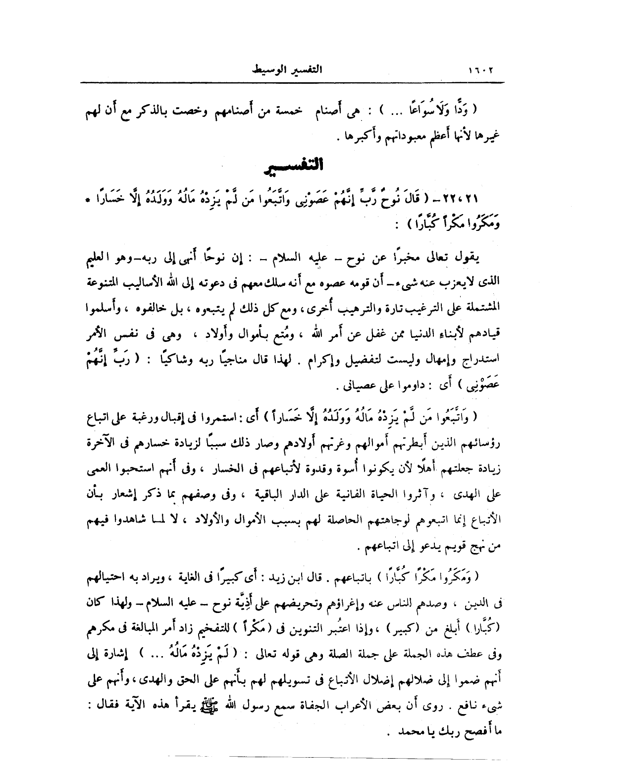 (وَدًّا وَلا سُوَاعًا ... ): هي أَصنام خمسة من أَصنامهم وخصت بالذكر مع أَن لهم غيرهما لأَنها أَعظم معبوداتهم وأَكبرها.