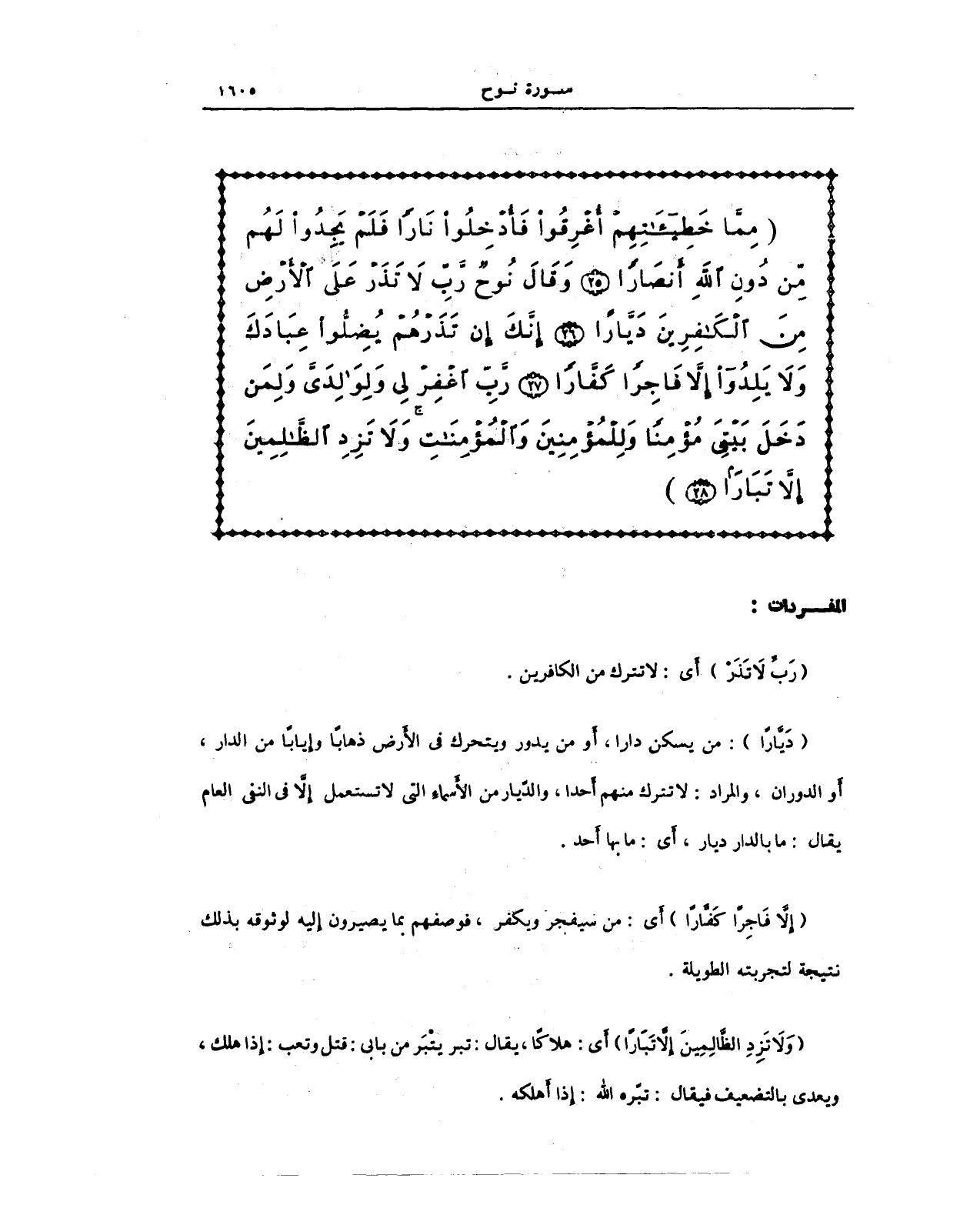 {مِمَّا خَطِيئَاتِهِمْ أُغْرِقُوا فَأُدْخِلُوا نَارًا فَلَمْ يَجِدُوا لَهُمْ مِنْ دُونِ اللَّهِ أَنْصَارًا (25) وَقَالَ نُوحٌ رَبِّ لَا تَذَرْ عَلَى الْأَرْضِ مِنَ الْكَافِرِينَ دَيَّارًا (26) إِنَّكَ إِنْ تَذَرْهُمْ يُضِلُّوا عِبَادَكَ وَلَا يَلِدُوا إِلَّا فَاجِرًا كَفَّارًا (27) رَبِّ اغْفِرْ لِي وَلِوَالِدَيَّ وَلِمَنْ دَخَلَ بَيْتِيَ مُؤْمِنًا وَلِلْمُؤْمِنِينَ وَالْمُؤْمِنَاتِ وَلَا تَزِدِ الظَّالِمِينَ إِلَّا تَبَارًا (28)} المفردات: