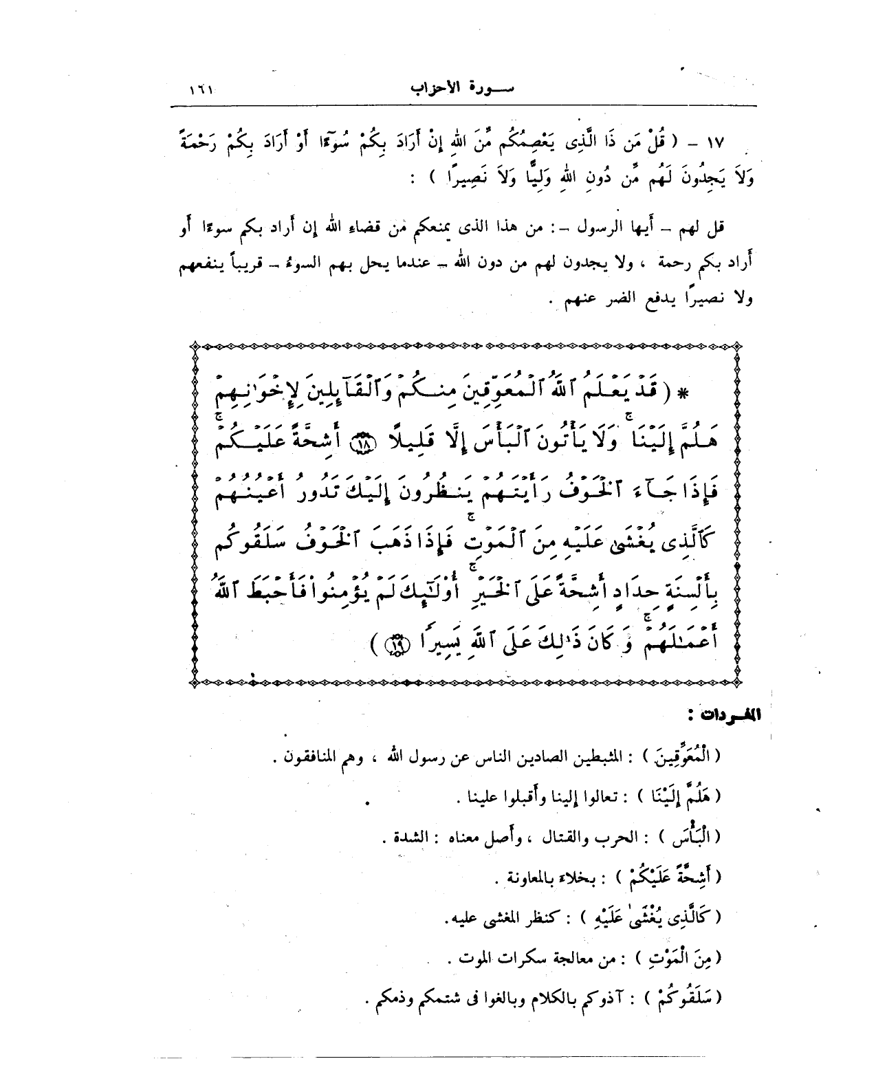 {قَدْ يَعْلَمُ اللَّهُ الْمُعَوِّقِينَ مِنْكُمْ وَالْقَائِلِينَ لِإِخْوَانِهِمْ هَلُمَّ إِلَيْنَا وَلَا يَأْتُونَ الْبَأْسَ إِلَّا قَلِيلًا (18) أَشِحَّةً عَلَيْكُمْ فَإِذَا جَاءَ الْخَوْفُ رَأَيْتَهُمْ يَنْظُرُونَ إِلَيْكَ تَدُورُ أَعْيُنُهُمْ كَالَّذِي يُغْشَى عَلَيْهِ مِنَ الْمَوْتِ فَإِذَا ذَهَبَ الْخَوْفُ سَلَقُوكُمْ بِأَلْسِنَةٍ حِدَادٍ أَشِحَّةً عَلَى الْخَيْرِ أُولَئِكَ لَمْ يُؤْمِنُوا فَأَحْبَطَ اللَّهُ أَعْمَالَهُمْ وَكَانَ ذَلِكَ عَلَى اللَّهِ يَسِيرًا (19)}