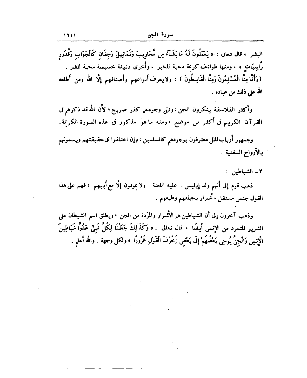 وذهب آخرون إِلى أَن الشياطين هم الأَشرار والمرَدة من الجن، ويطلق اسم الشيطان على الشرير المتمرد من الإِنس أَيضًا، وقال تعالى: {وَكَذَلِكَ جَعَلْنَا لِكُلِّ نَبِيٍّ عَدُوًّا شَيَاطِينَ الْإِنْسِ وَالْجِنِّ يُوحِي بَعْضُهُمْ إِلَى بَعْضٍ زُخْرُفَ الْقَوْلِ غُرُورًا} ولكل وجهة. والله أَعلم.