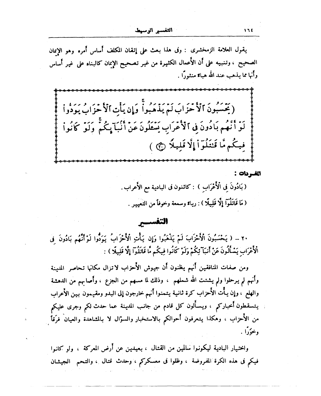 {يَحْسَبُونَ الْأَحْزَابَ لَمْ يَذْهَبُوا وَإِنْ يَأْتِ الْأَحْزَابُ يَوَدُّوا لَوْ أَنَّهُمْ بَادُونَ فِي الْأَعْرَابِ يَسْأَلُونَ عَنْ أَنْبَائِكُمْ وَلَوْ كَانُوا فِيكُمْ مَا قَاتَلُوا إِلَّا قَلِيلًا}: