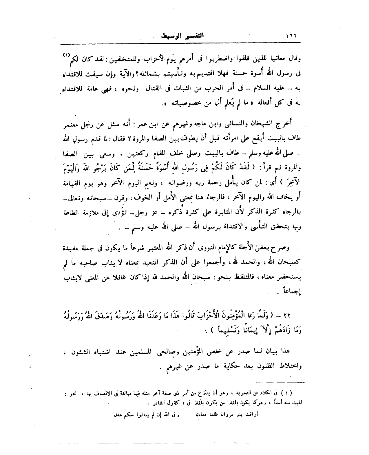 أخرج الشيخان والنسائى وابن ماجه وغيرهم عن ابن عمر: أنه سئل عن رجل معتمر طاف بالبيت أيقع على امرأَته قبل أن يطوف بين الصفا والمروة؟ فقال: لما قدم رسول الله - صلى الله عليه وسلم - طاف بالبيت وصلى خلف المقام ركعتين، وسعى بين الصفا والمروة ثم قرأَ: {لَقَدْ كَانَ لَكُمْ فِي رَسُولِ اللَّهِ أُسْوَةٌ حَسَنَةٌ لِمَنْ كَانَ يَرْجُو اللَّهَ وَالْيَوْمَ الْآخِرَ} أي: لمن كان يأْمل رحمة ربه ورضوانه، ونعيم اليوم الآخر وهو يوم القيامة أو يخاف الله واليوم الآخر، فالرجاءُ هنا بمعنى الأَمل أو الخوف، وقرن - سبحانه وتعالى - بالرجاء كثرة الذكر لأَن المثابرة على كثرة ذكره - عَزَّ وَجَلَّ - تؤدي إلى ملازمة الطاعة وبها يتحقق التأَسي والاقتداءُ برسول الله - صلى الله عليه وسلم -.