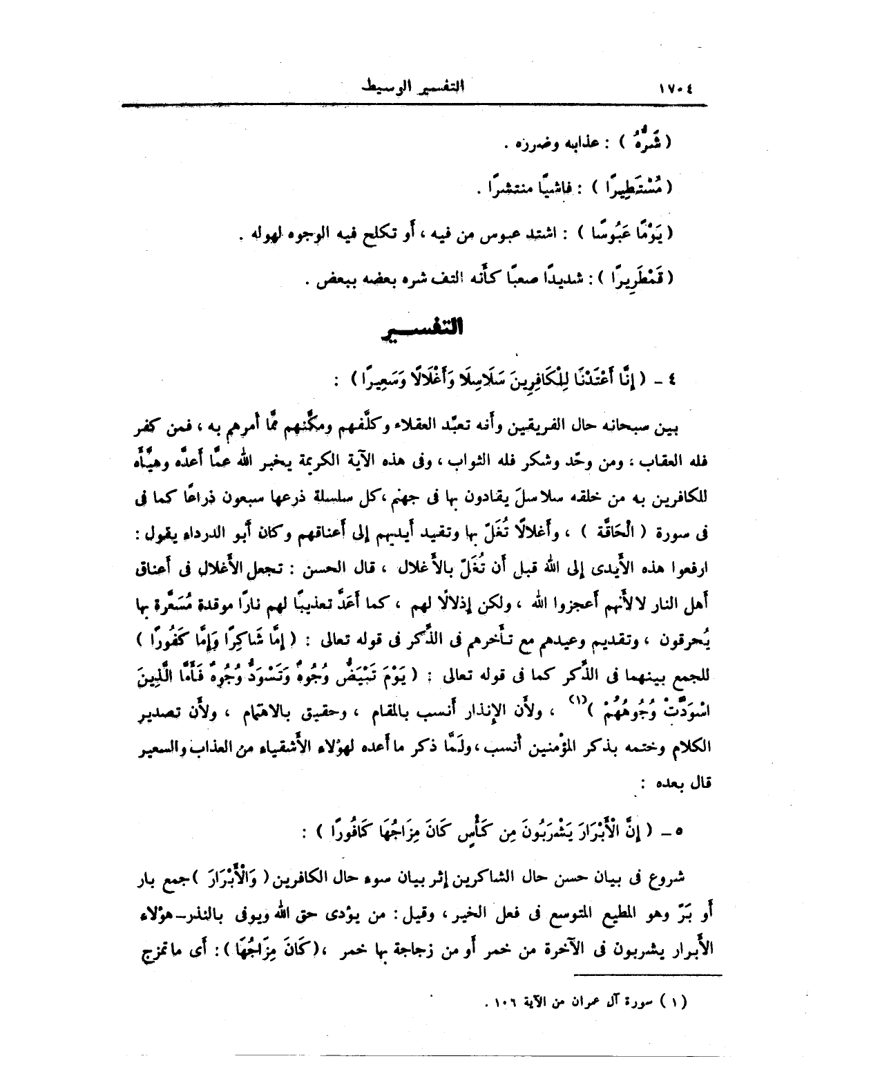 بين سبحانه حال الفريقين وأَنه تعبَّد العقلاء وكلَّفهم ومكَّنهم ممَّا أَمرهم به، فمن كفر فله العقاب، ومن وحّد وشكر فله الثواب، وفي هذه الآية الكريمة يخبر الله عمَّا أَعدَّه وهيَّأَه للكافرين به من خلقه سلاسلَ يقادون بها في جهنم، كل سلسلة ذرعها سبعون ذراعًا كما في سورة (الْحَاقَّة)، وأَغلالًا تُغَلّ بها وتقيد أَيديهم إِلى أَعناقهم وكان أَبو الدرداءِ يقول: ارفعوا هذه الأَيدي إِلى الله قبل أضن تُغَلّ بالأَغلال، قال الحسن: تجعل الأَغلال في أَعناق أَهل النار لا لأَنهم أَعجزوا الله، ولكن إِذلالًا لهم، كما أَعَدَّ تعذيبًا لهم نارًا موقدة مُسَعَّرة بها يُحرقون، وتقديم وعيدهم مع تأَخرهم في الذِّكر في قوله تعالى: (إِمَّا شَاكِرًا وَإِمَّا كَفُورًا) للجمع بينهما في الذِّكر كما في قوله تعالى: (يَوْمَ تَبْيَضُّ وُجُوهٌ وَتَسْوَدُّ وُجُوهٌ فَأَمَّا الَّذِينَ اسْوَدَّتْ وُجُوهُهُمْ) (¬1)، ولأَن الإِنذار أَنسب بالمقام، وحقيق بالاهتمام، ولأَن تصدير الكلام وختمه بذكر المؤْمنين أَنسب، ولَمَّا ذكر ما أَعده لهؤلاءِ الأَشقياءِ من العذاب والسعير قال بعده: