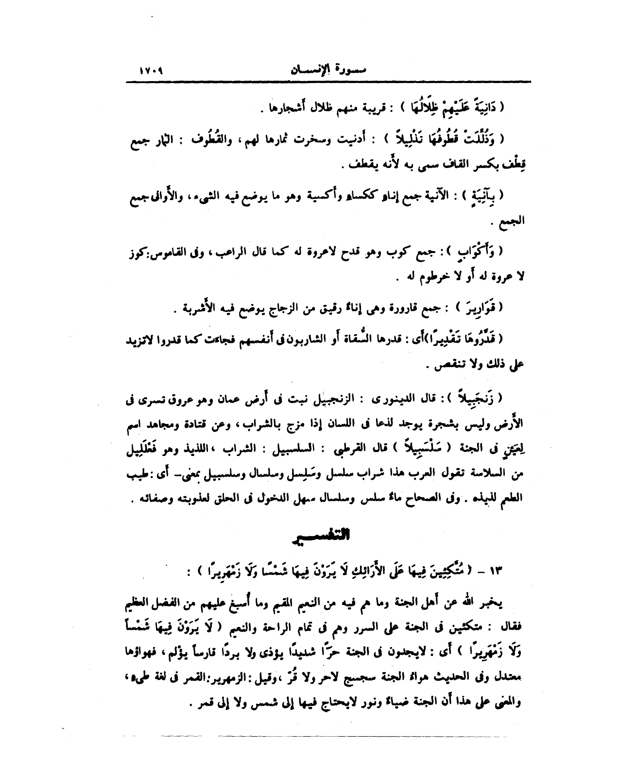 يخبر الله عن أَهل الجنة وما هم فيه من النعيم المقيم وما أُسبغ عليهم من الفضل العظيم فقال: متكئين في الجنة على السرر وهم في تمام الراحة والنعيم (لا يَرَوْنَ فِيهَا شَمْسًا وَلا زَمْهَرِيرًا) أَي: لا يجدون في الجنة حرًّا شديدًا ولا قُرّ، وقيل: الزمهرير: القمر في لغة طيءٍ، والمعنى على هذا أَن الجنة ضياءٌ ونور لا يحتاج فيها إِلى الشمس ولا إِلى قمر.