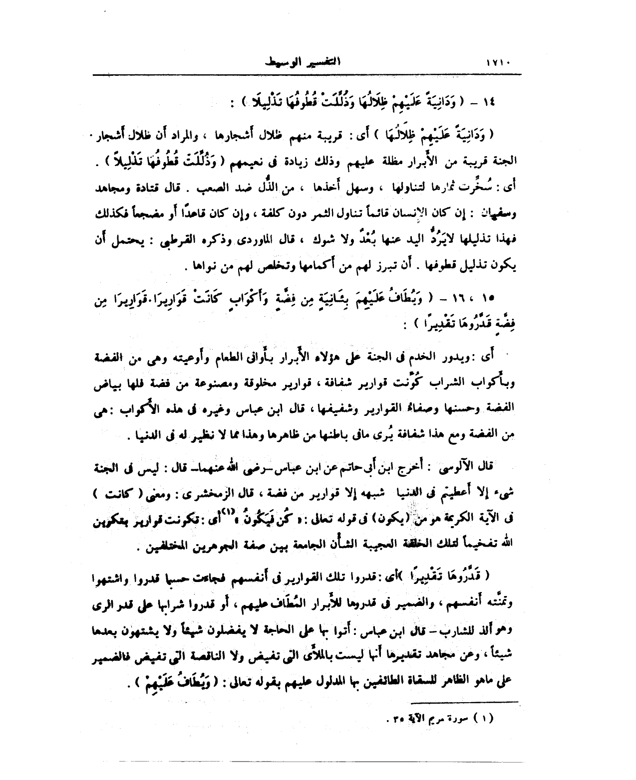 (وَدَانِيَةً عَلَيْهِمْ ظِلالُهَا) أَي: قريبة منهم ظلال أَشجارها، والمراد أَن ظلال أَشجار الجنة قريبة من الأَبرار مظلة عليهم وذلك زيادة في نعيمهم (وَذُلِّلَتْ قُطُوفُهَا تَذْلِيلًا) أَي: سُخِّرت ثمارها لتناولها، وسهل أَخذها، من الذُّل ضد الصعب. قال قتادة ومجاهد وسفيان: إِن كان الإِنسان قائمًا تناول الثمر دون كلفة، وإِن كان قاعدًا أَو مضجعًا فكذلك فهذا تذليلها لا يَرُدٌّ اليد عنها بُعْدٌ ولا شوك، قال الماوردي وذكره القرطبي: يحتمل أَن يكون تذليل قطوفها. أَن تبرز لهم من أَكمامها وتخلص لهم من نواها.